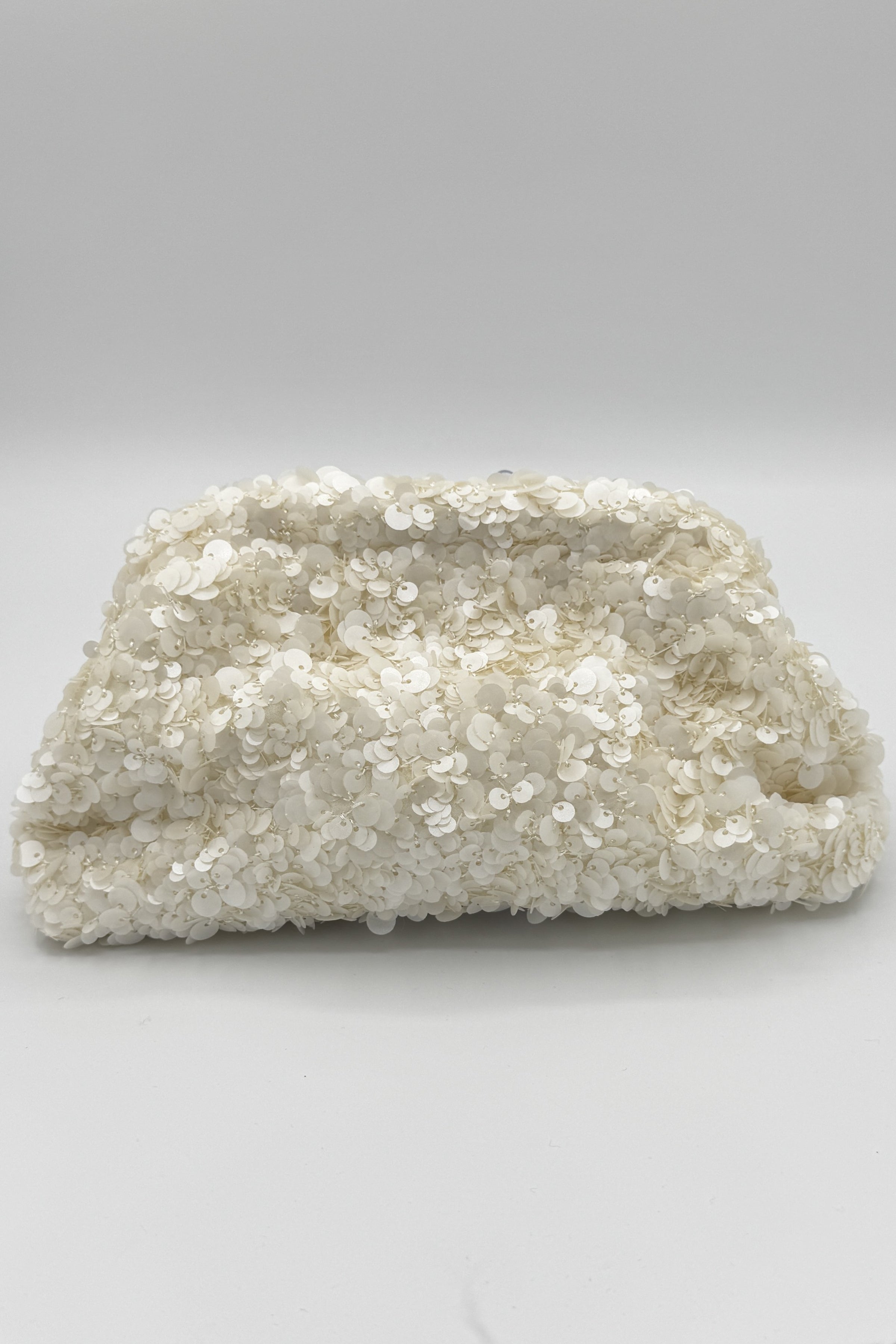 This elegant clutch is fully adorned with ivory sequins, creating a soft shimmer that catches the light beautifully. Its plush, gathered silhouette adds a touch of volume and texture, while the minimalist shape keeps the focus on the intricate sequin embellishment - perfect for evening or special occasions.
