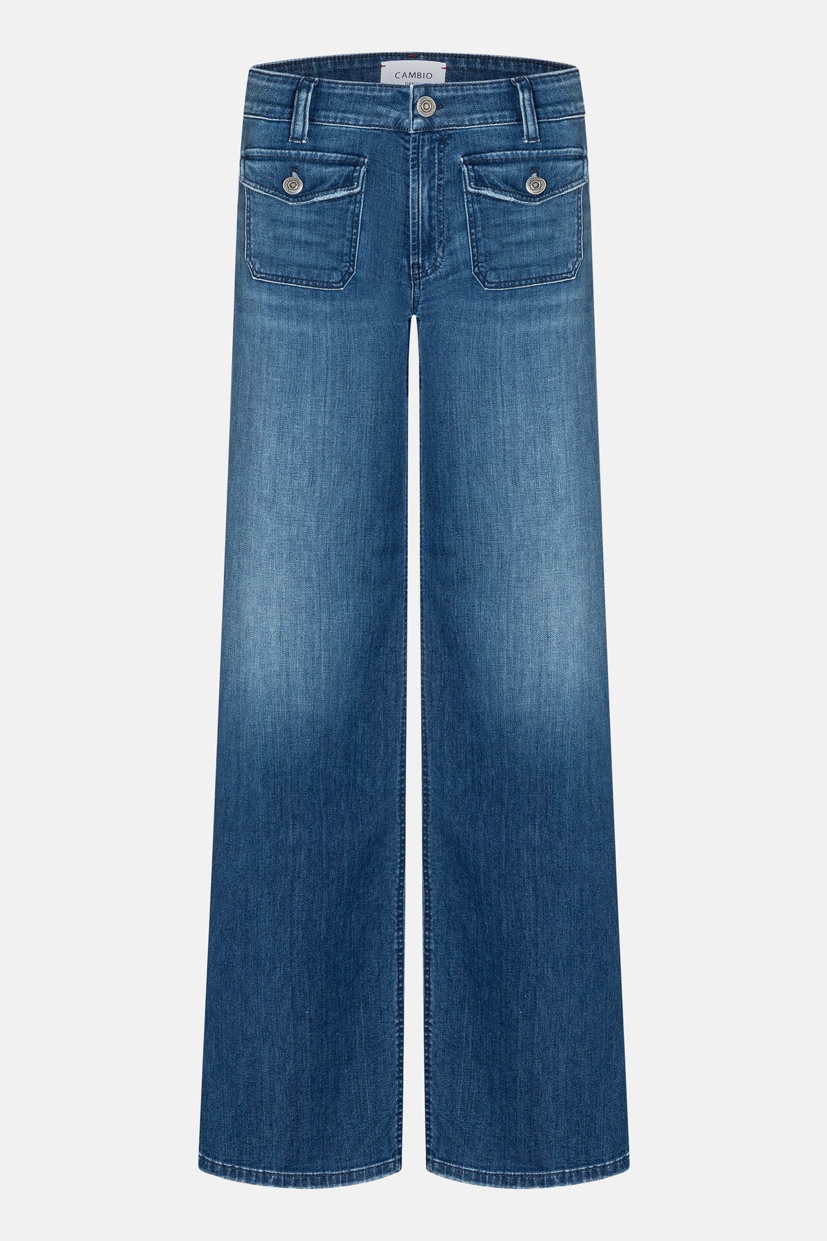 Aimee Patched Pocket wide-leg jeans in full length. This wide, long denim in classic blue is a stylish highlight of the current CAMBIO collection. Patch front pockets with distinctive buttons give the style a touch of French chic. The flowing, wide-cut leg creates a modern, confident silhouette – a fashion statement that no wardrobe should be without. Spandex provides additional comfort.