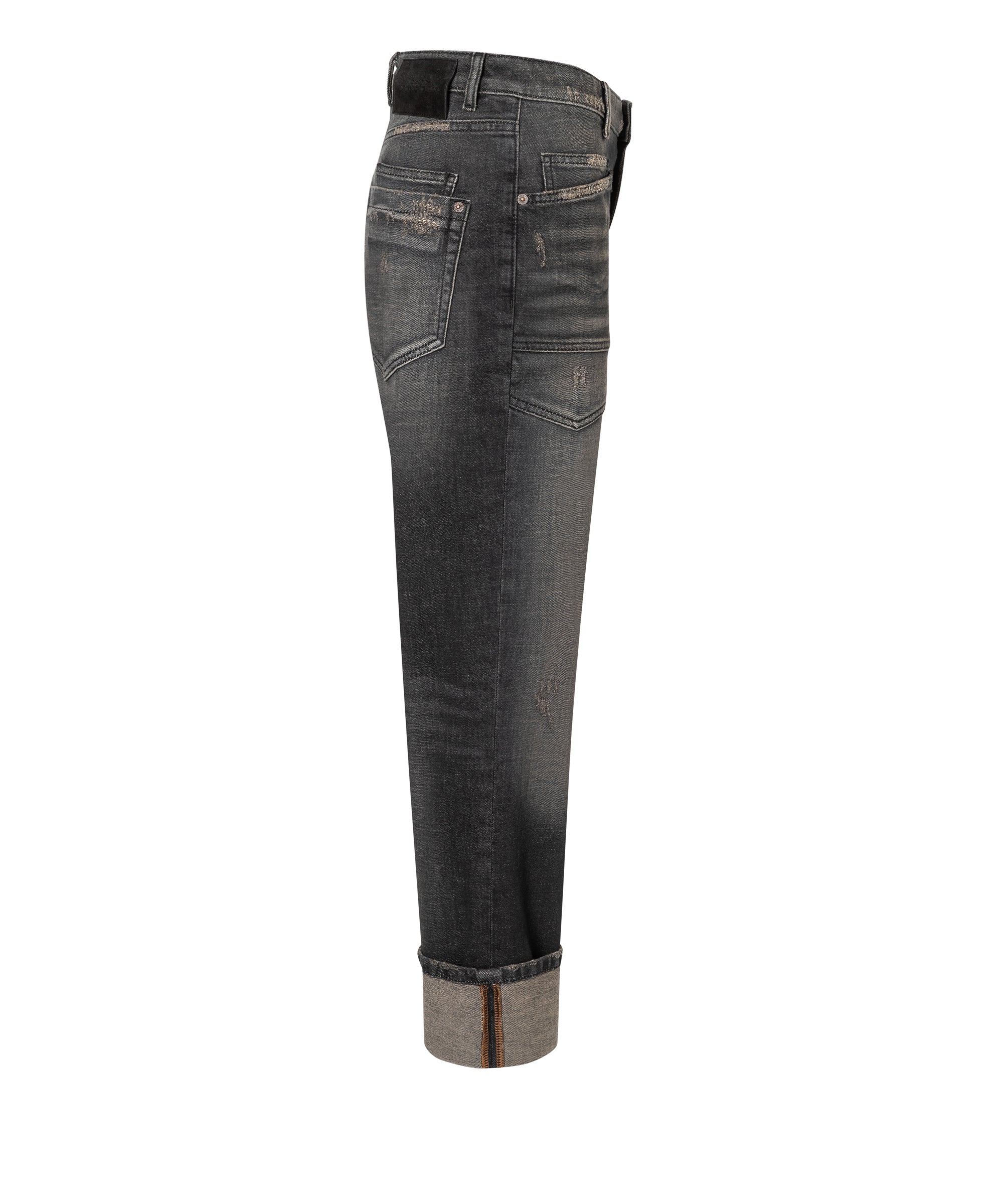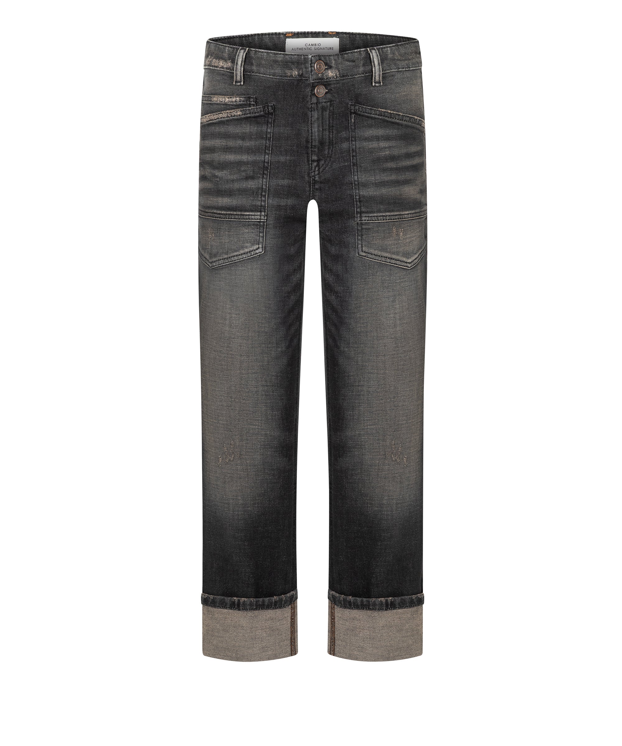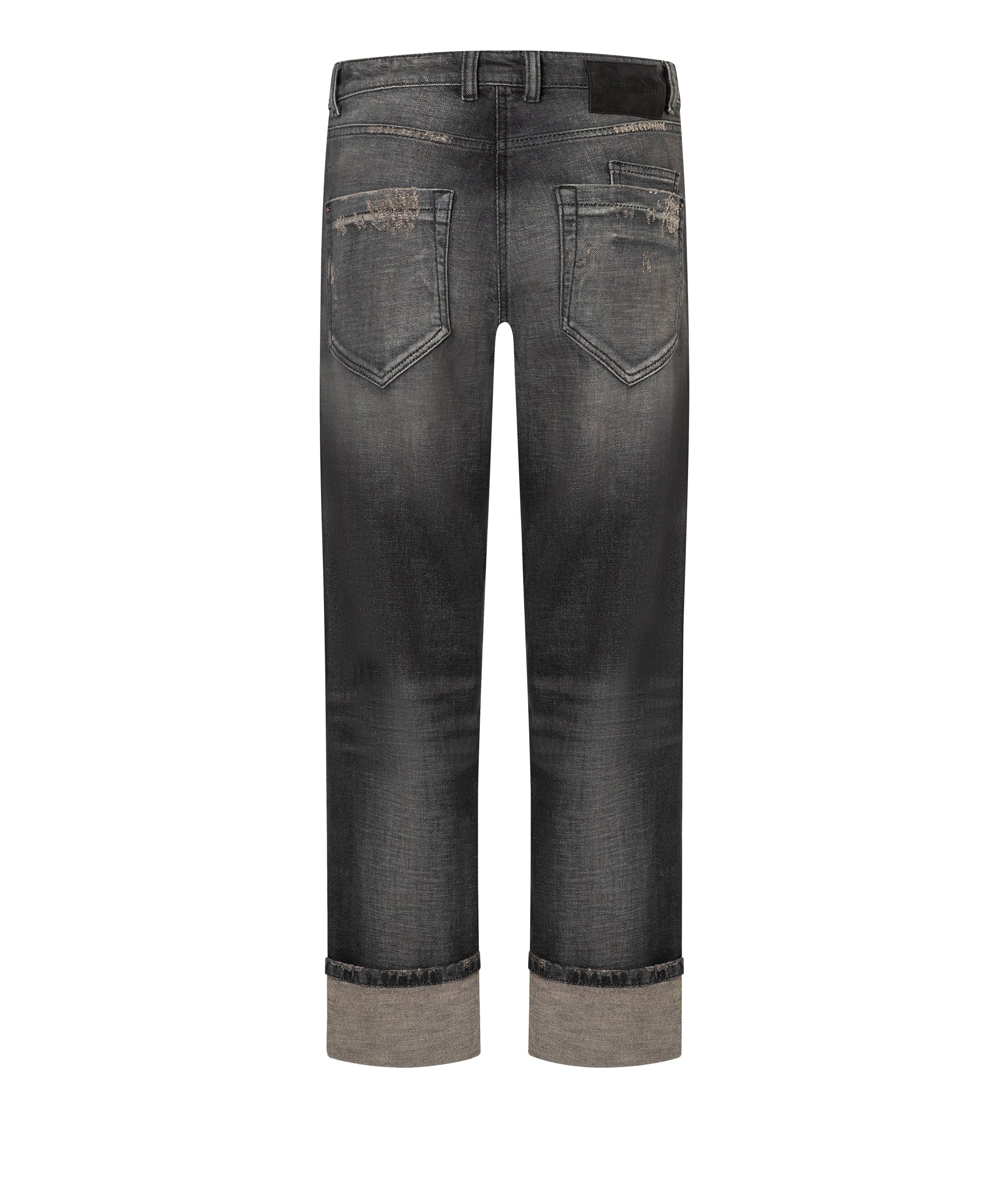 Crafted in vintage-wash denim, the Guili pants feature a relaxed cropped silhouette with wide turned-up hems. Distressed detailing and fading highlight their casual appeal, while front patch pockets and back pockets enhance practicality. Double-button closure completes this effortlessly modern, versatile denim design.