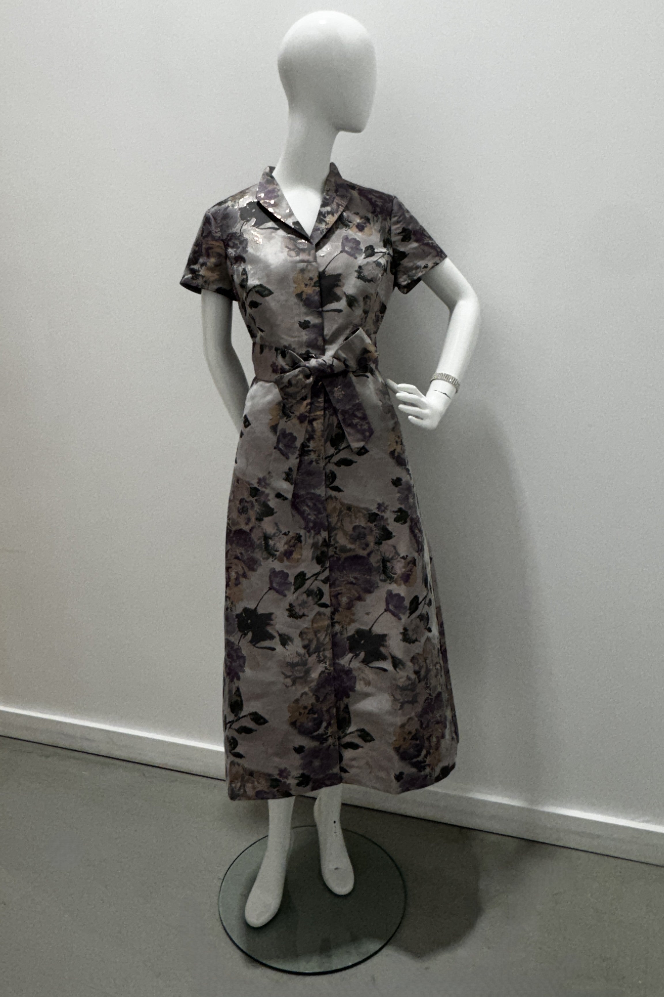 The Robin dress features a tailored shirt-collar neckline, short sleeves, and a defined waist accented with a structured self-tie belt. Its floral jacquard fabric adds elegant texture, while the tea-length skirt offers graceful movement. A polished, vintage-inspired silhouette suited for refined daytime occasions.