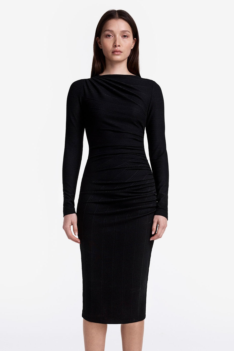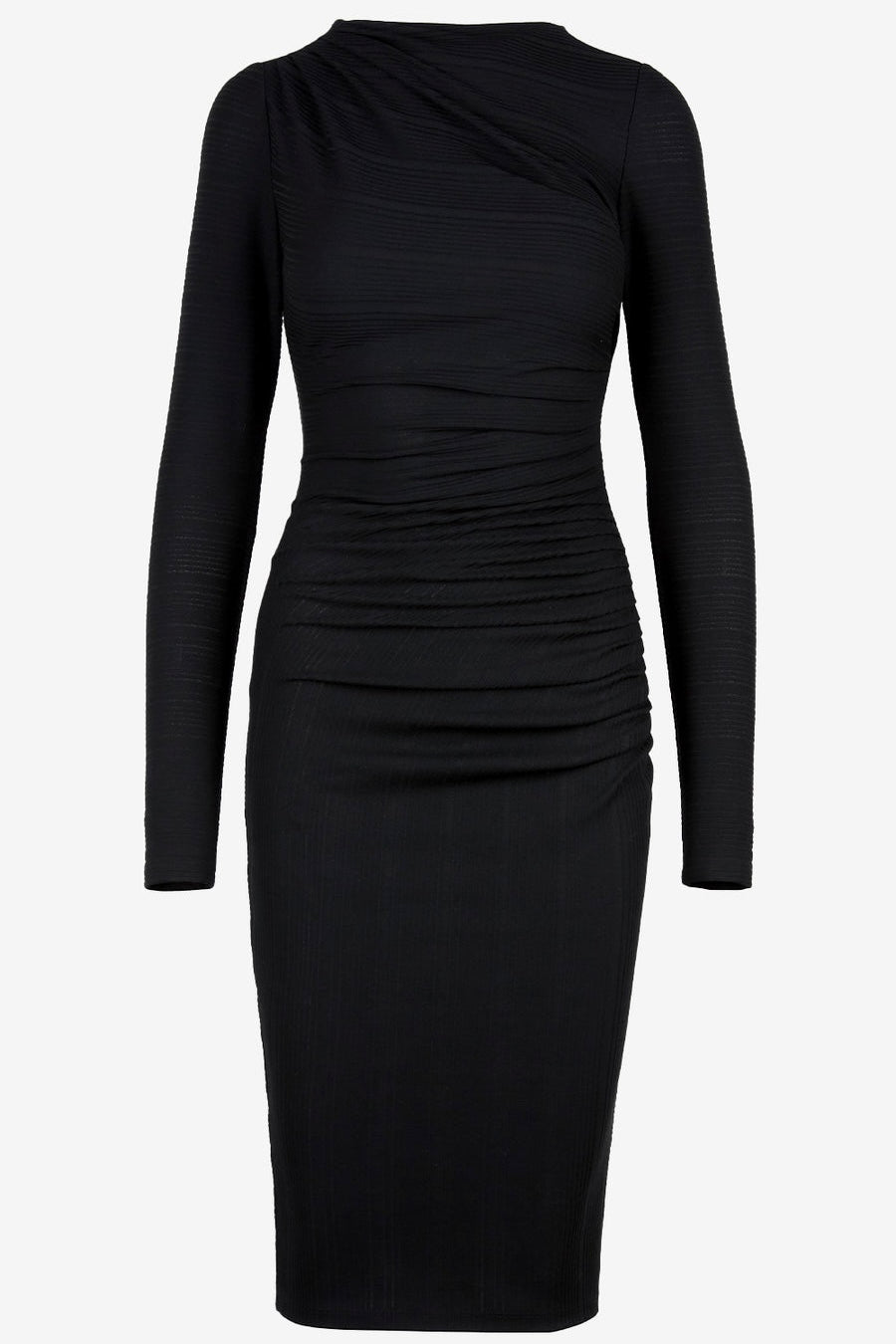 The Smythe Ruched Knit Midi Dress channels subtle 90’s inspiration with its sleek, sculptural design. Crafted in a close-fitting knit, it features variegated stripes that elongate the silhouette and add understated visual interest. Expertly placed tucking creates a flattering drape at the shoulder, waist, and hips, highlighting natural curves while maintaining a sophisticated finish. Falling to a polished midi length, this versatile dress transitions effortlessly from desk to dinner, making it a true day-to-night essential. Designed to fit true to size, it offers both comfort and elegance, embodying Smythe’s signature balance of modern tailoring and timeless style.