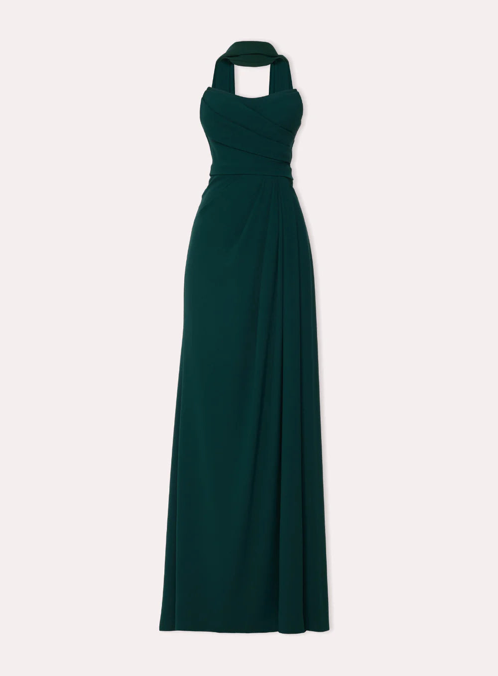 A halter-neck gown with a gracefully draped silhouette, enhanced by a gathered bodice and elegant flow.