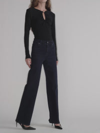 This sleek, form-fitting top embodies understated elegance with a subtle peek-a-boo keyhole accented by a distinctive gold knot button, the hallmark of this collection. Made from stretchy jersey spandex, it offers both comfort and a flattering silhouette, perfect for sophisticated, confident styling.