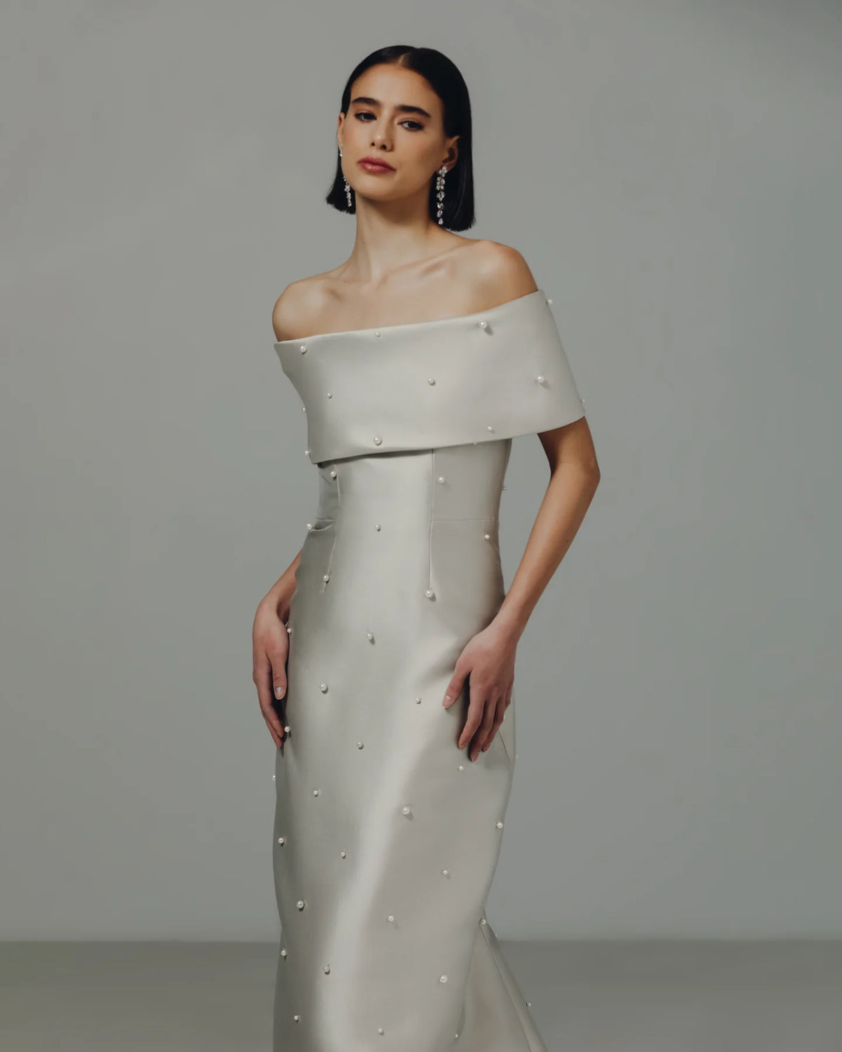 CATHERINE REGEHR Catherine Regehr Off Shoulder Roll Collar gown with Scattered Pearls