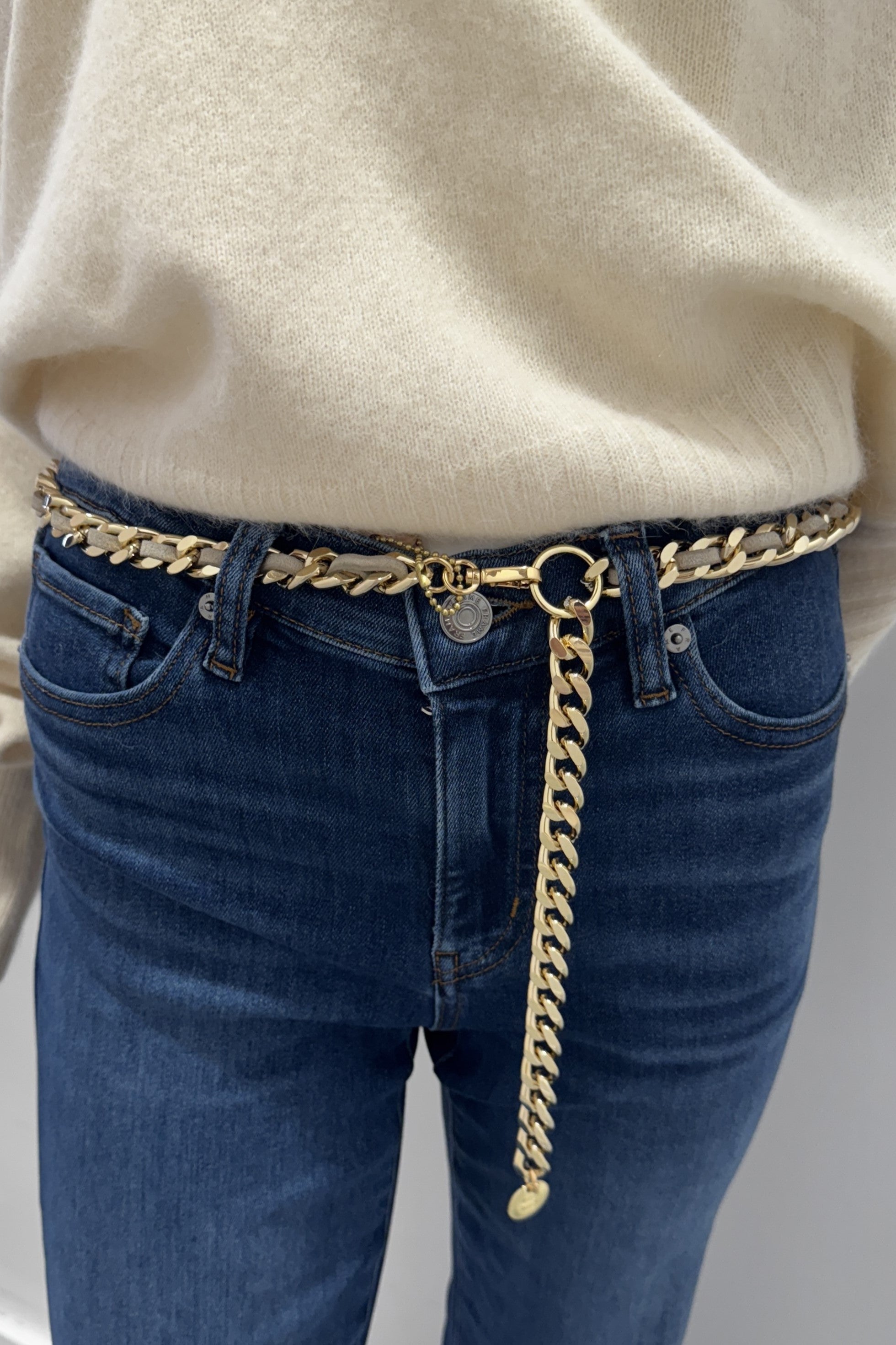 Doone sits on the waist adding an edgy glam to any look. Featuring a woven suede leather chain with center front closure. Our new suede fashion colours will add a pop of colour to your looks.