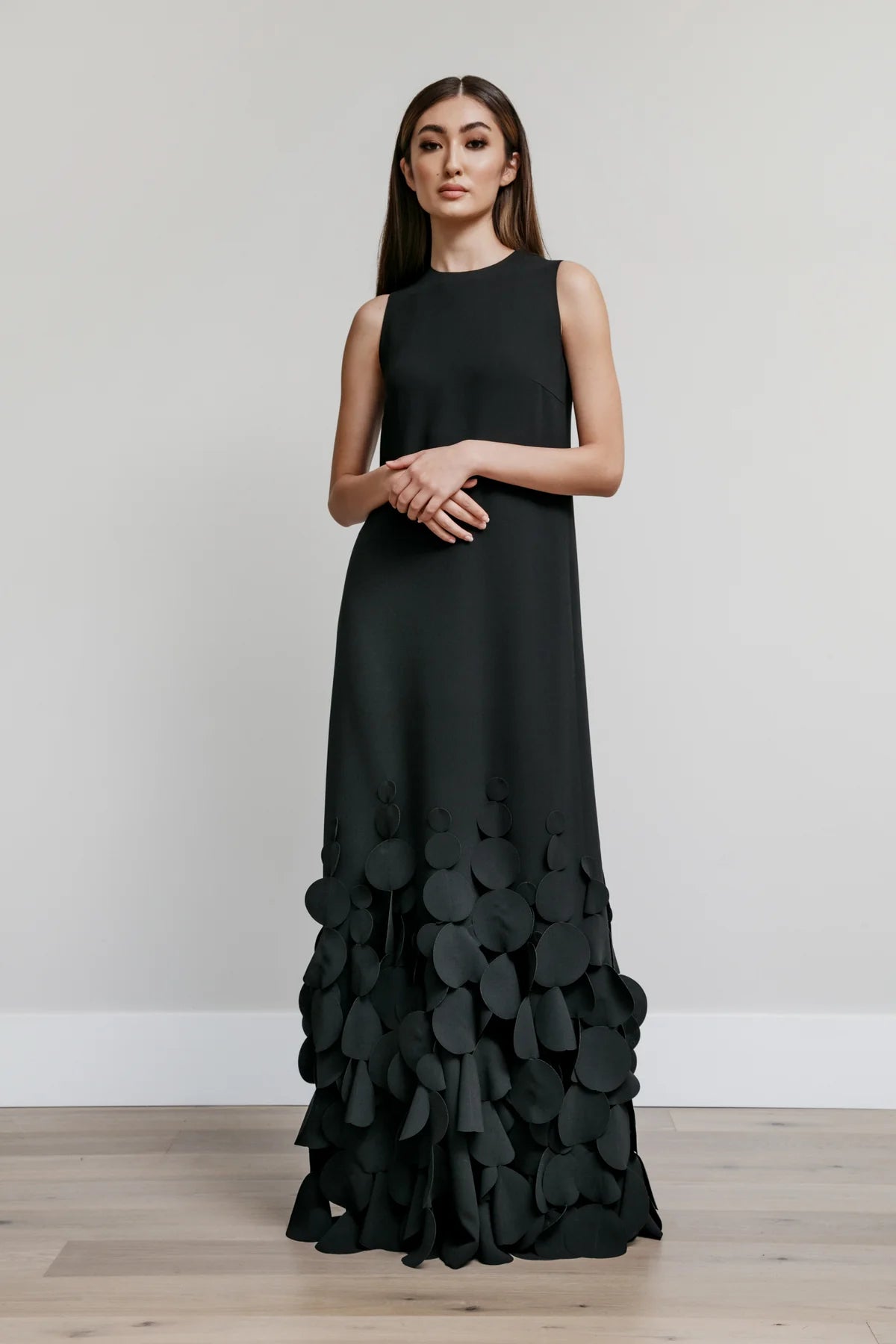An elegant Catherine Regehr creation featuring a jewel neckline and sleeveless design. The flowing A-line silhouette extends to the floor with exquisite vine laser-cut details at the hem. Finished with a concealed back zipper and self-lining for refined sophistication.