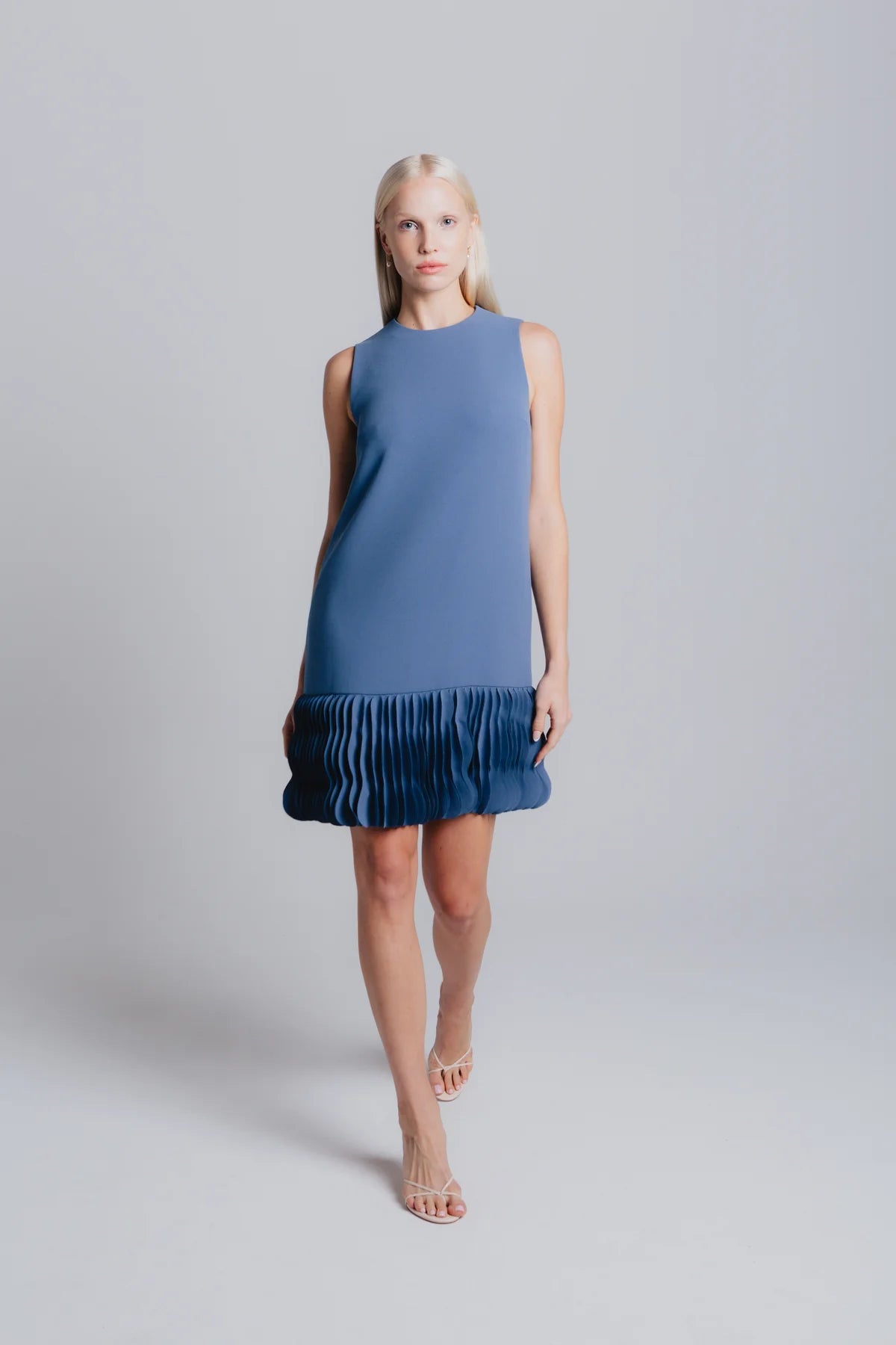 A sophisticated shift dress with jewel neckline and sleeveless design. Relaxed fit with subtle A-line silhouette. Hand-sewn wave-patterned hem adds artistic detail. Concealed back zipper with hook-and-eye closure. Self-lined for refined comfort.