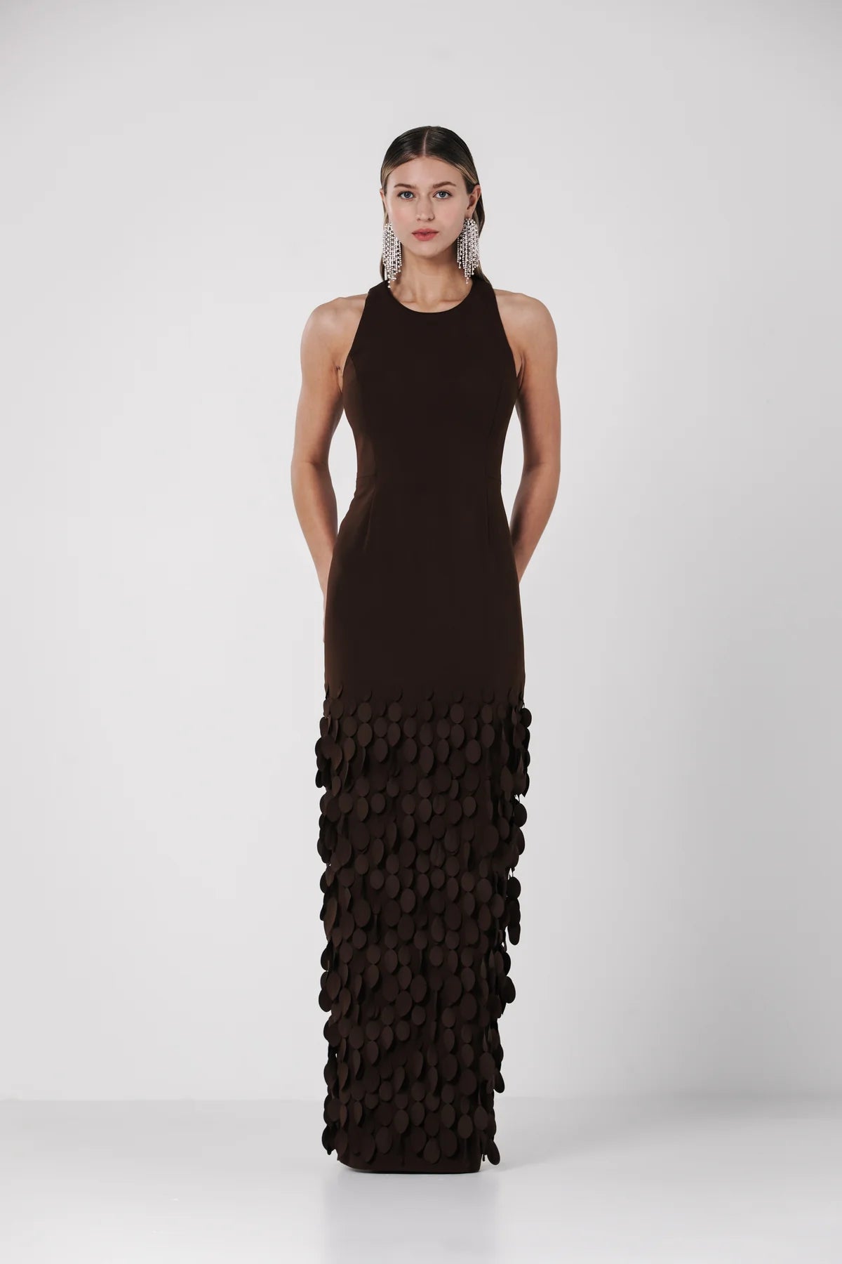 This sleeveless dress features a racer neckline, a structured boned waist, and a slim, floor-length skirt with a back slit. The hem is elegantly finished with laser-cut small oval details.