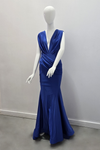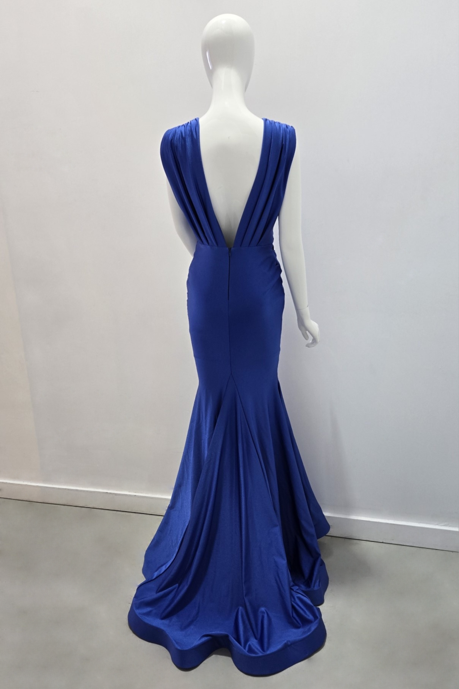 Exude timeless elegance in this double V-neck gown, featuring gathered shoulders that create a soft, draped effect. The plunging neckline and open back add a touch of allure, while the sash-accented waist enhances the silhouette. Finished with a floor-length mermaid skirt, this gown delivers graceful sophistication.