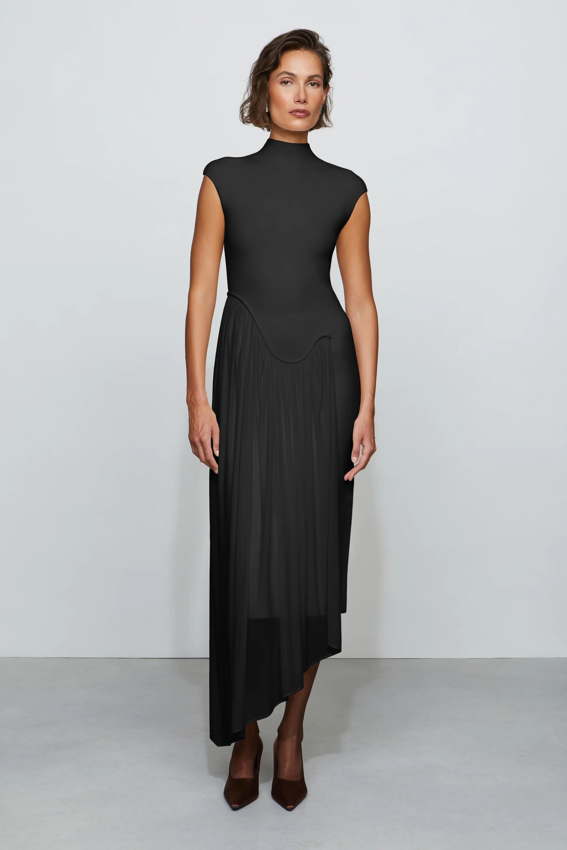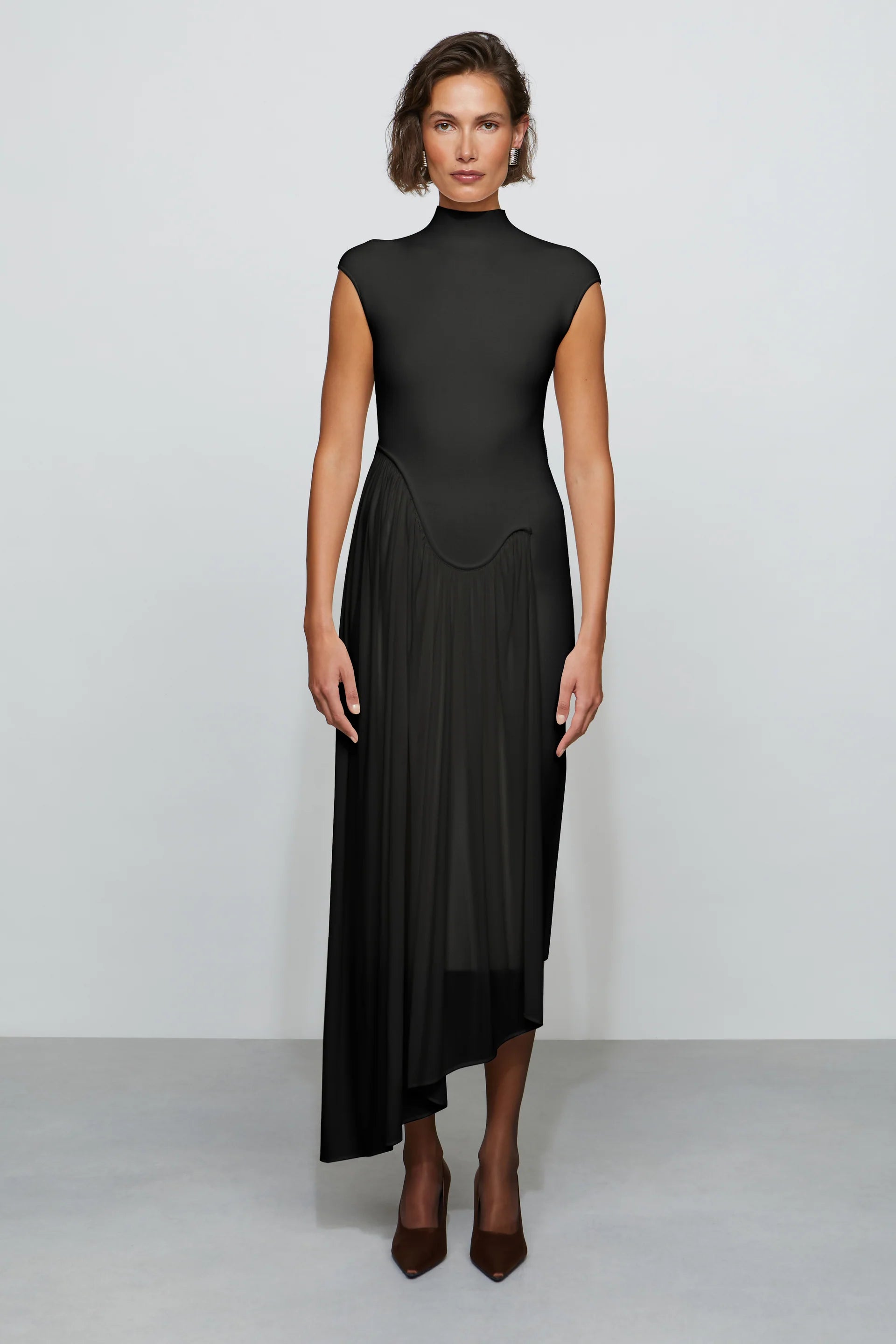 Sculpted midi dress in compact knit with a soft chiffon jersey drape. The curved piping and asymmetric hem do the work—flattering, easy, and ready for anything.
