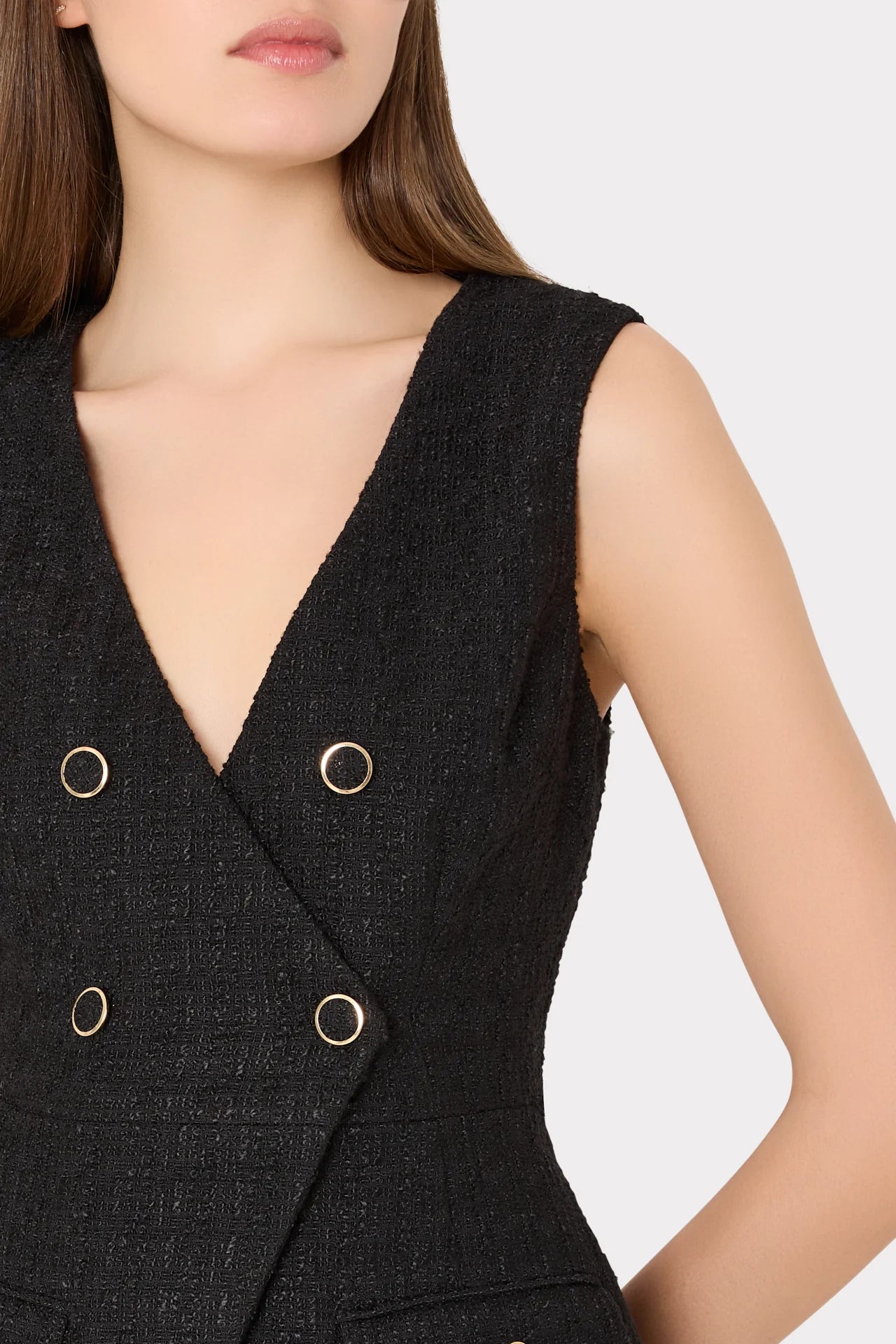This mini blazer-style dress is crafted with a bouclé vest bodice combined with a pleated, satin skirt. It's finished with gold-covered button accents and a back zipper to close. This versatile style is great for cocktails, dinner parties, and even more formal events.