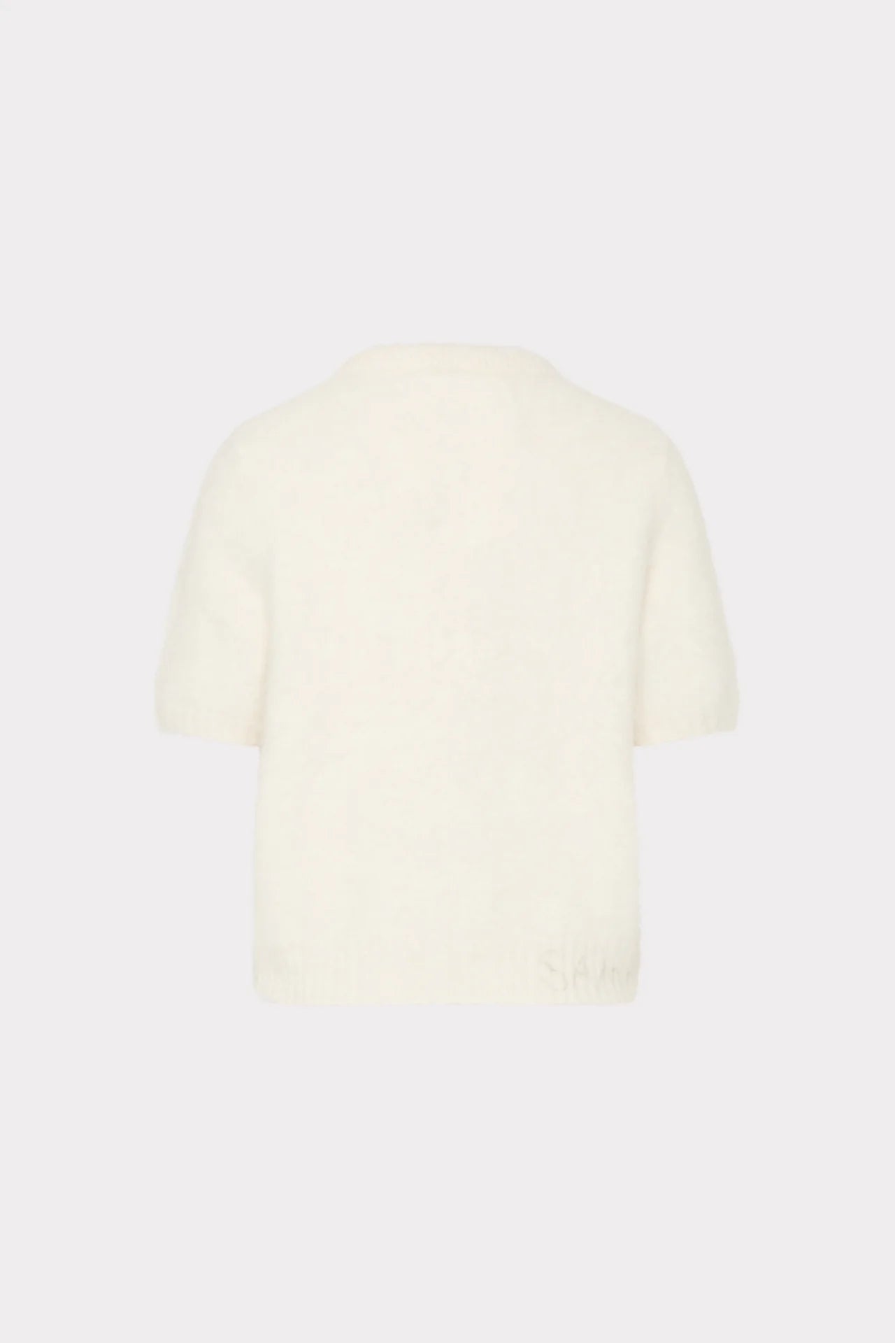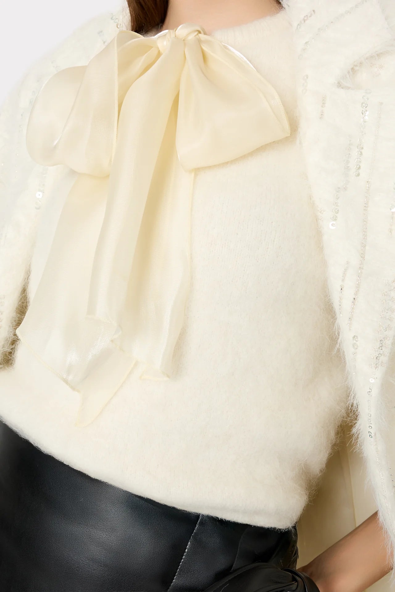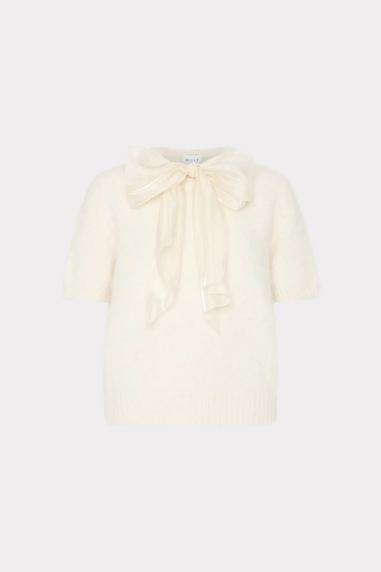 This cozy short-sleeve sweater is finished with a statement satin bow at the neckline. Pair it with a sleek trouser for an elevated desk-to-dinner look, or style it with denim for an effortlessly chic weekend outfit.