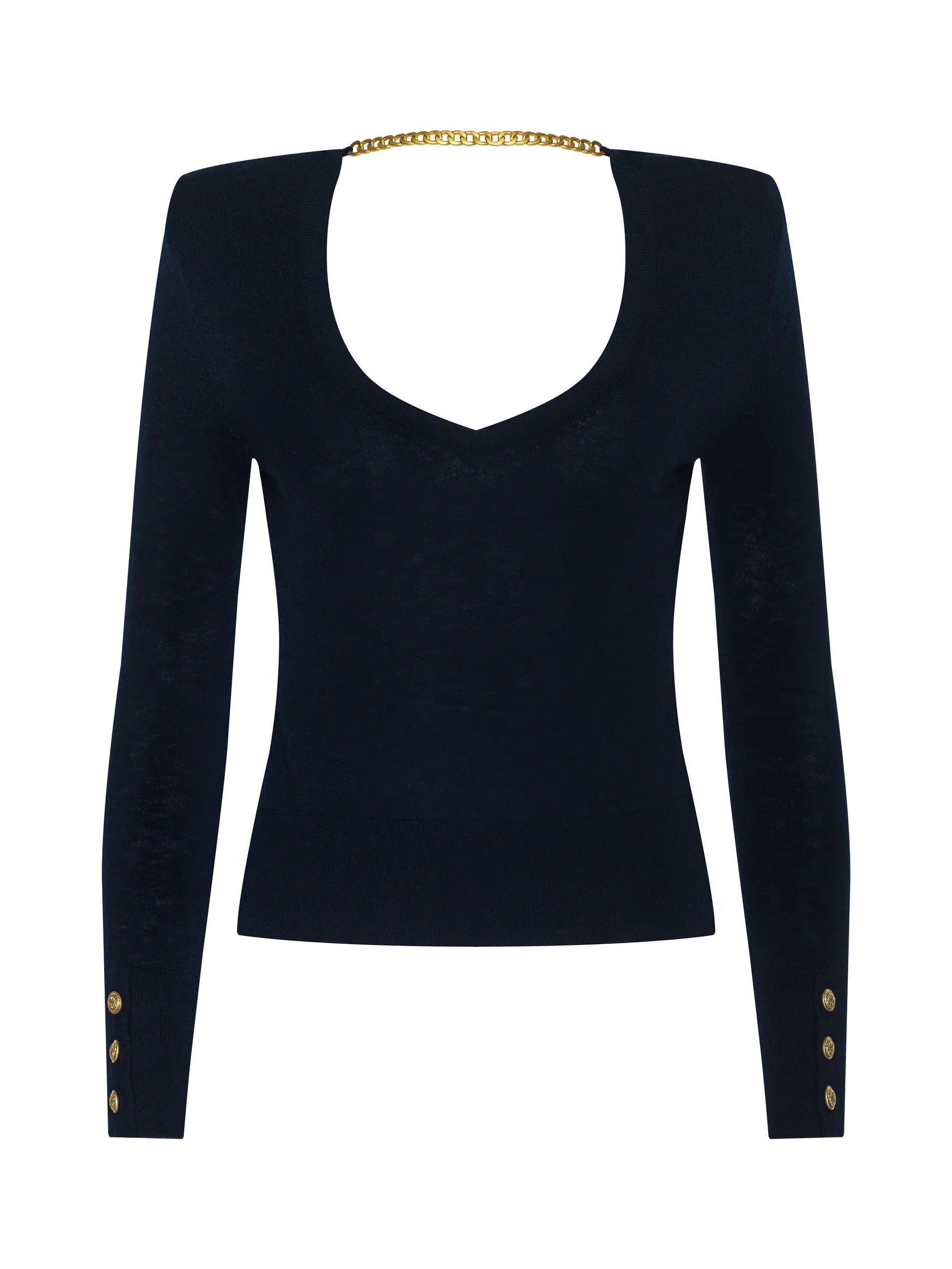 The Kolie makes a statement from every angle. Designed with a deep V-neckline in both the front and back, it’s accented by a high-shine chain detail. Structured at the shoulders for a defined shape, this refined knit elevates the everyday with polished attitude.