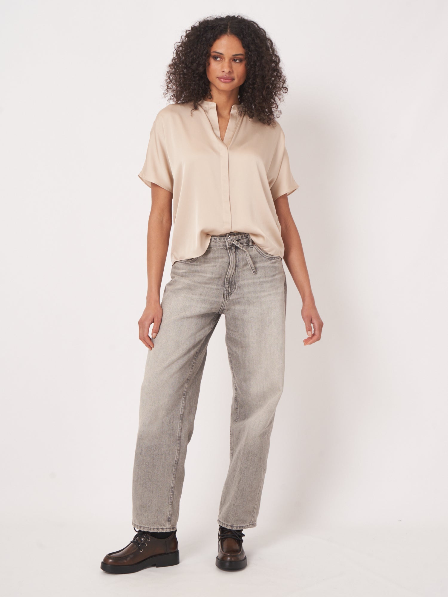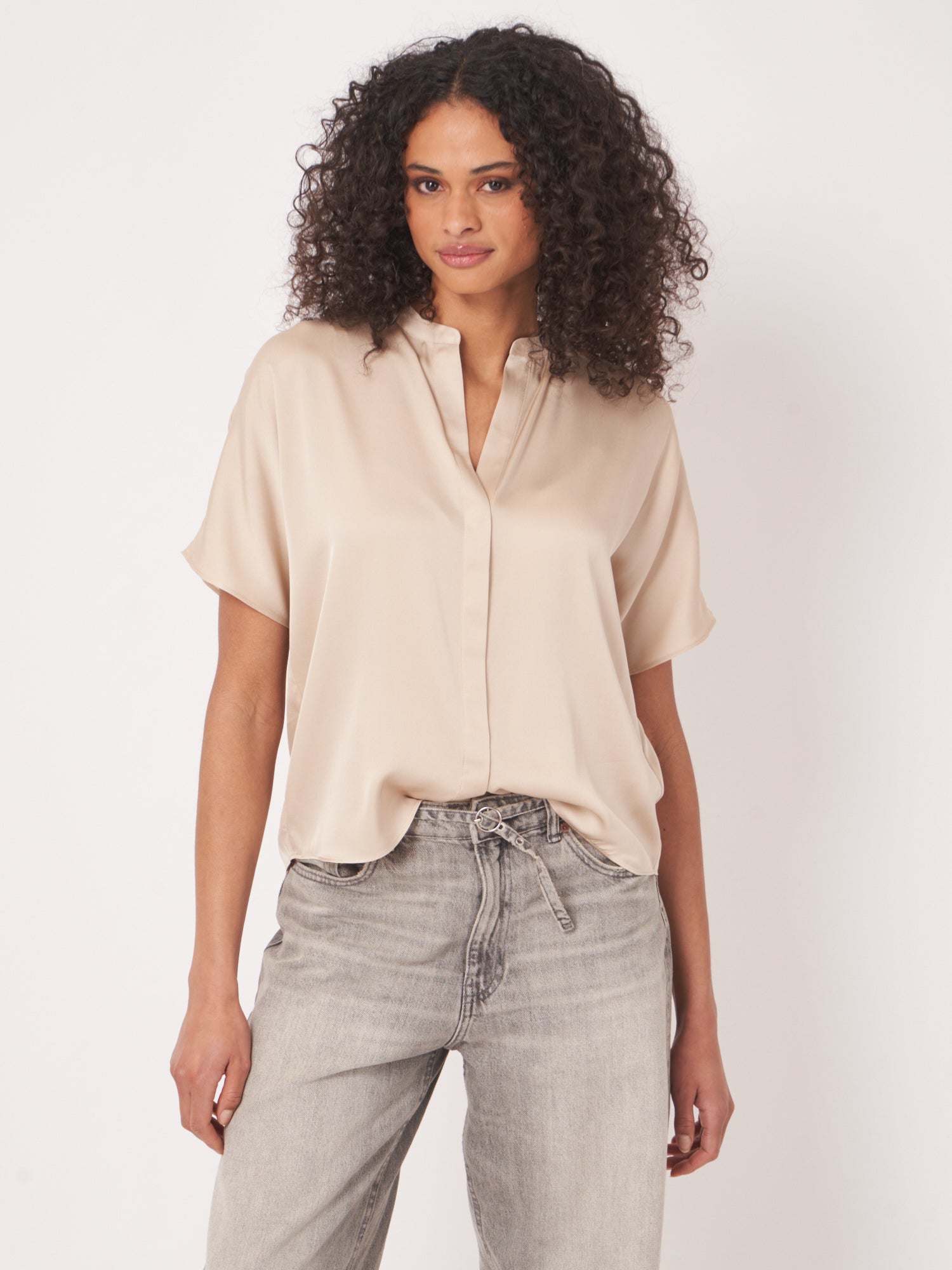 This relaxed blouse showcases a fluid drape and subtle sheen for an elevated yet effortless look. Designed with a clean banded neckline, hidden front placket, and short sleeves, it transitions seamlessly from casual styling to polished layering.