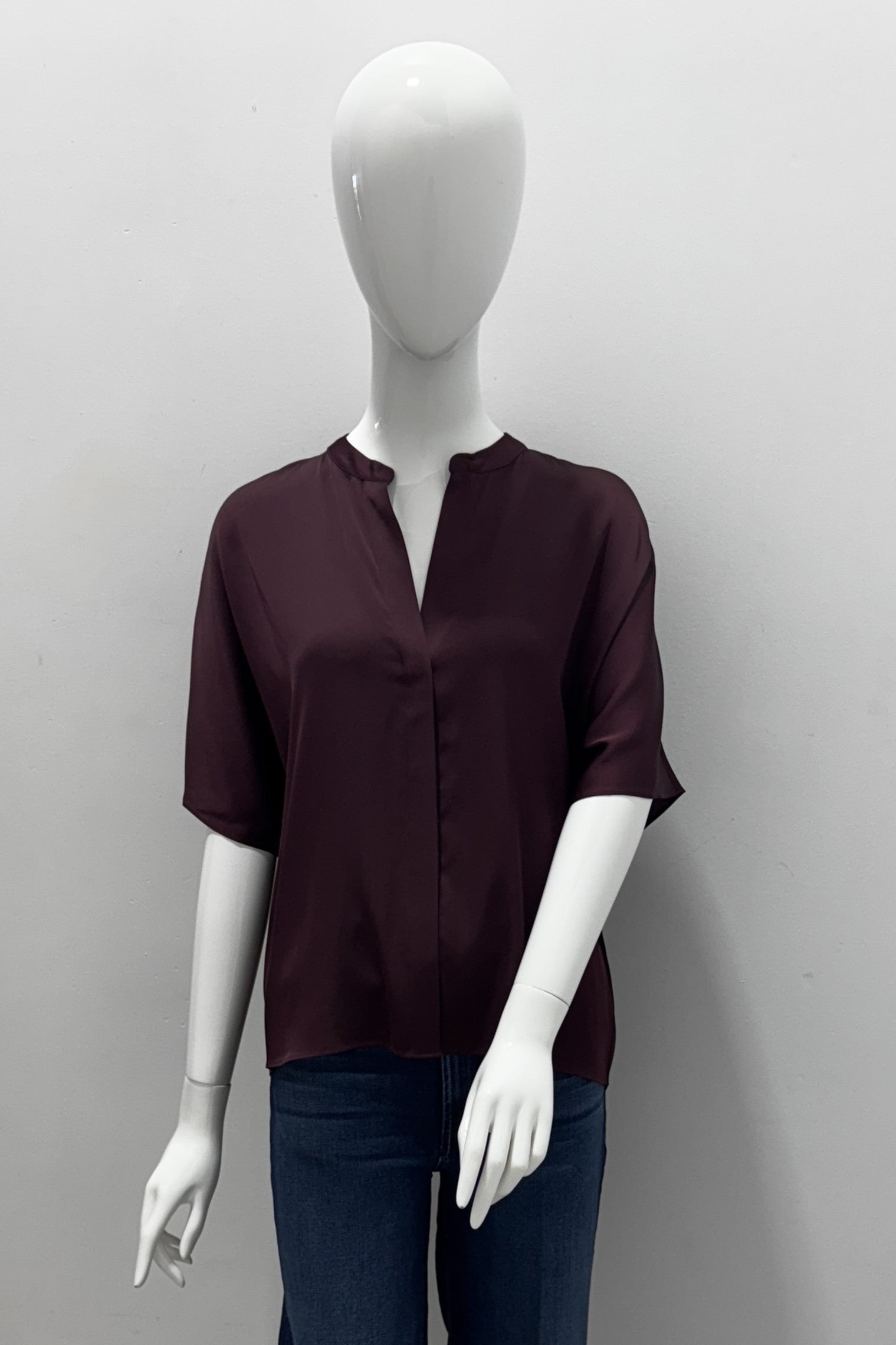 This relaxed blouse showcases a fluid drape and subtle sheen for an elevated yet effortless look. Designed with a clean banded neckline, hidden front placket, and short sleeves, it transitions seamlessly from casual styling to polished layering.