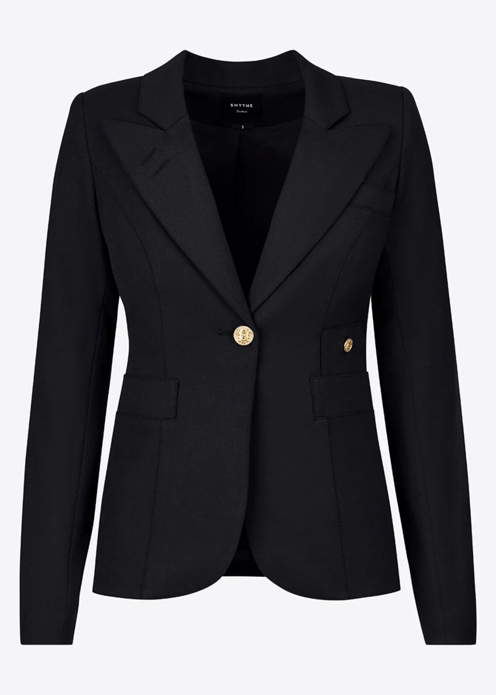 The classic Smythe blazer is reimagined in stretch viscose with a double back vent. Its slim, single-breasted silhouette and signature brass buttons offer timeless elegance. Ideal for year-round wear; size up for curvier fits.