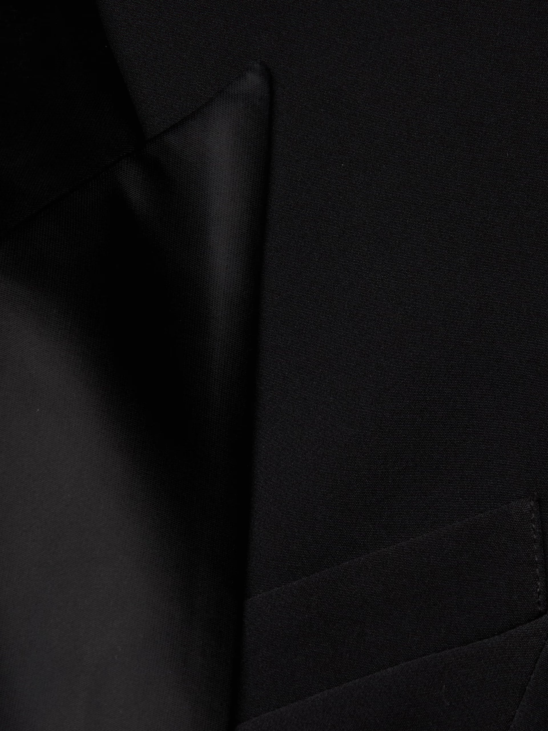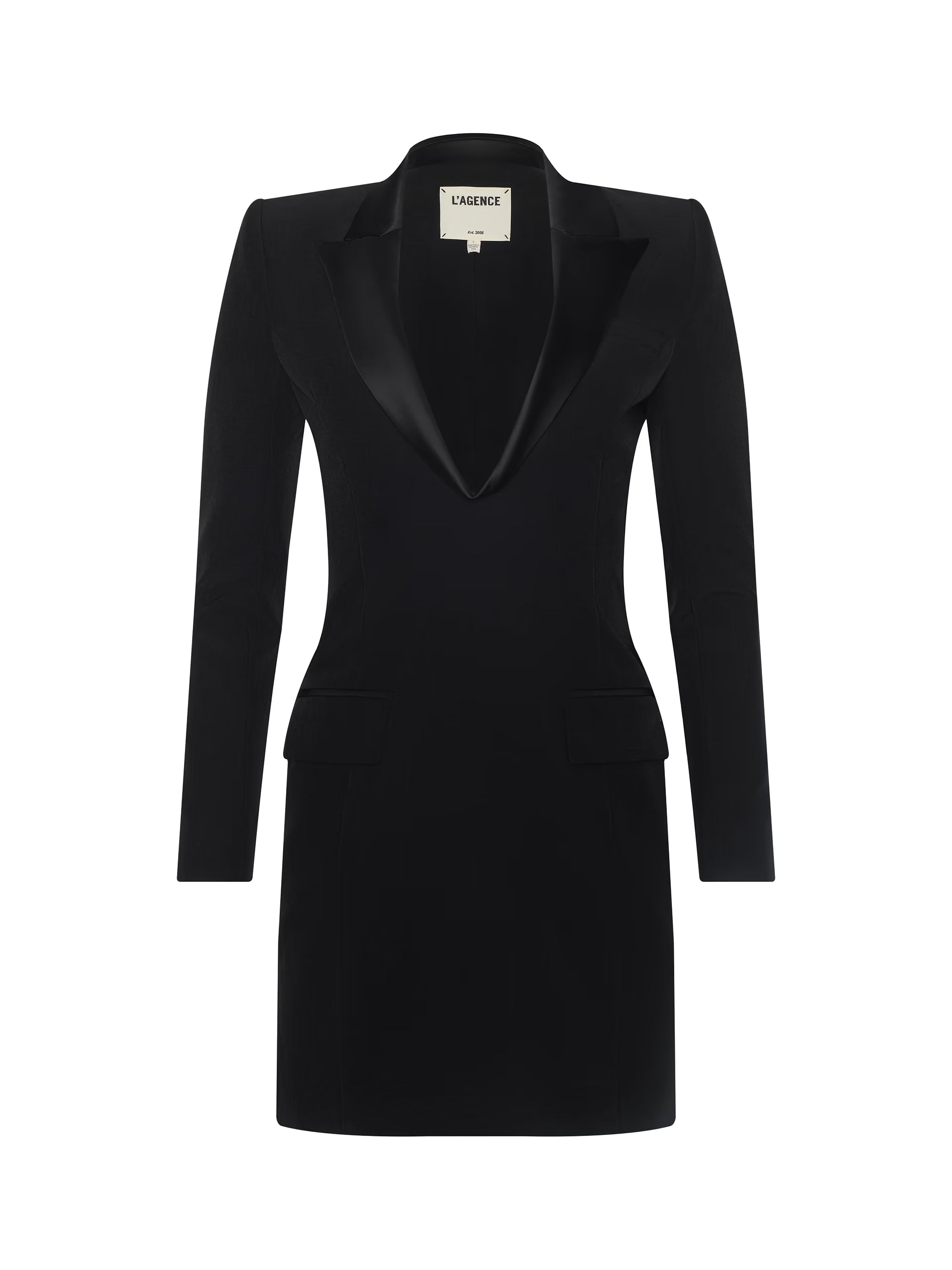 The Esti mini dress is a striking expression of feminine power dressing. Cut in a sharp silhouette, it features a plunging U-neck framed by satin lapels that evoke classic tuxedo styling. Strong shoulders and a nipped-in waist create a sculpted shape, while flap pockets and gold button detailing at the cuffs complete its ultra chic look.