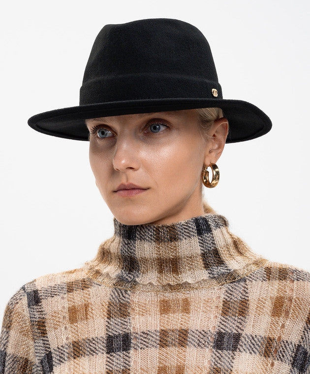 Twinset wool hat with a wide brim, designed in sleek black for timeless appeal. Crafted from pure wool, it features structured shaping and a subtle gold metal T logo at the front, adding refined detail to its minimalist silhouette.