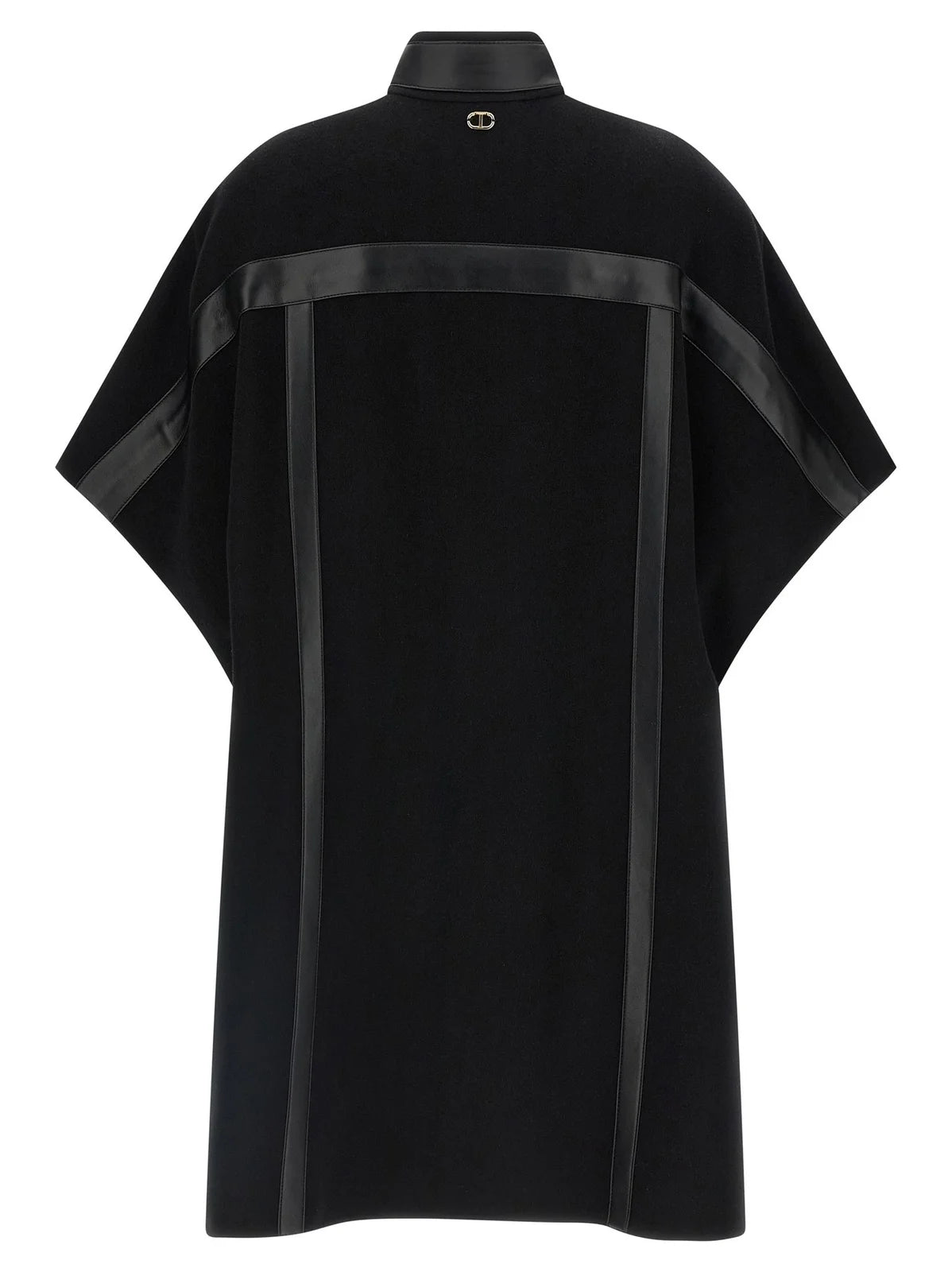 Crafted from a structured wool-blend, this dramatic cape features bold vegan leather trim, utility-style buckle straps, and a high-neck collar with snap closure. The wide, flowing silhouette merges contemporary edge with outerwear function for a statement layering piece.