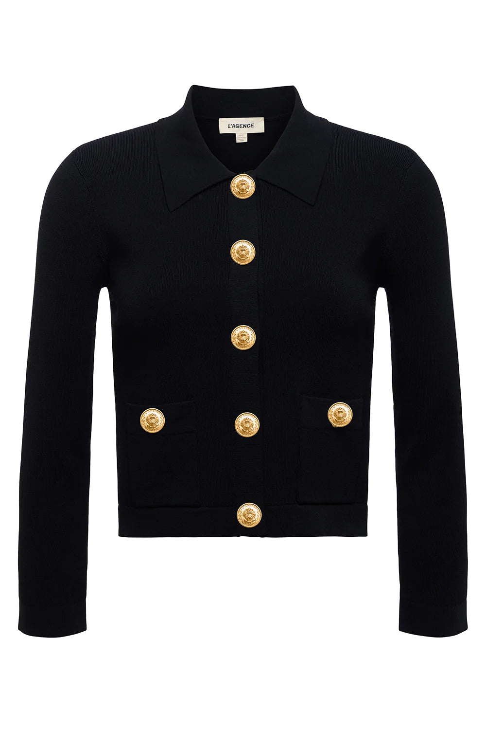 Le Cardigan Osiris de L'Agence offre un look intemporel et chic avec un tricot épais extensible, une coupe courte, des épaules rembourrées, des poches fausses passepoilées à boutons dorés, et une fermeture boutonnée raffinée pour une silhouette féminine parfaite.
