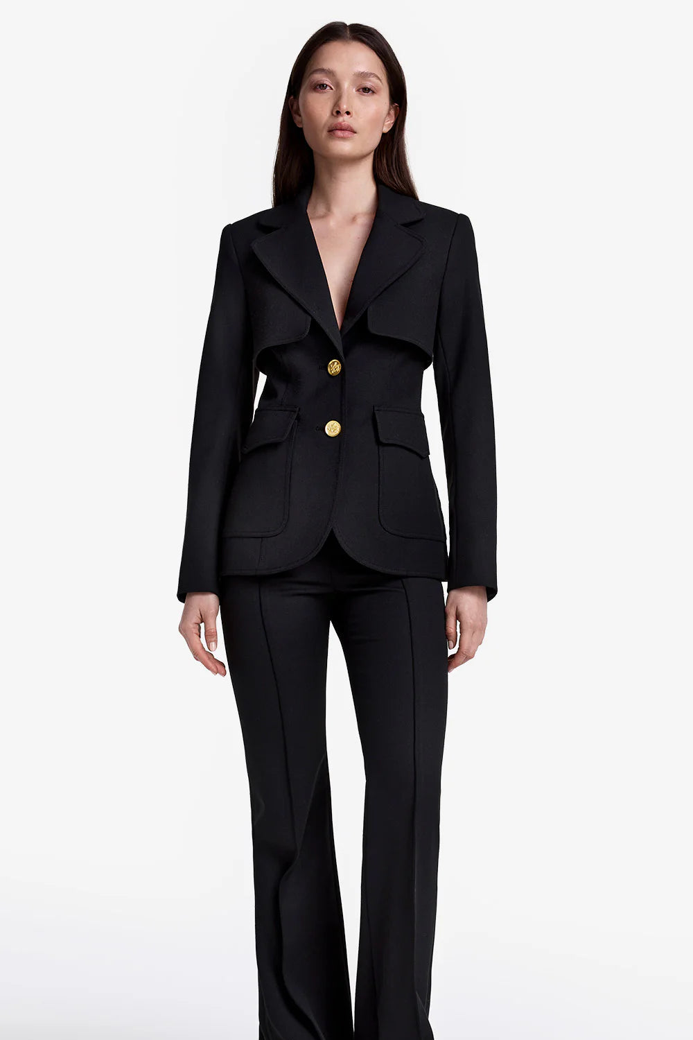 Taille mi-haute avec une légère évasement, ce pantalon extensible longueur totale présente une silhouette avec un devant plat (sans ceinture), un pli cousu et une fermeture éclair latérale. Il est conçu pour être ajusté à la taille et aux hanches et constitue un excellent pantalon noir à avoir dans votre garde-robe.