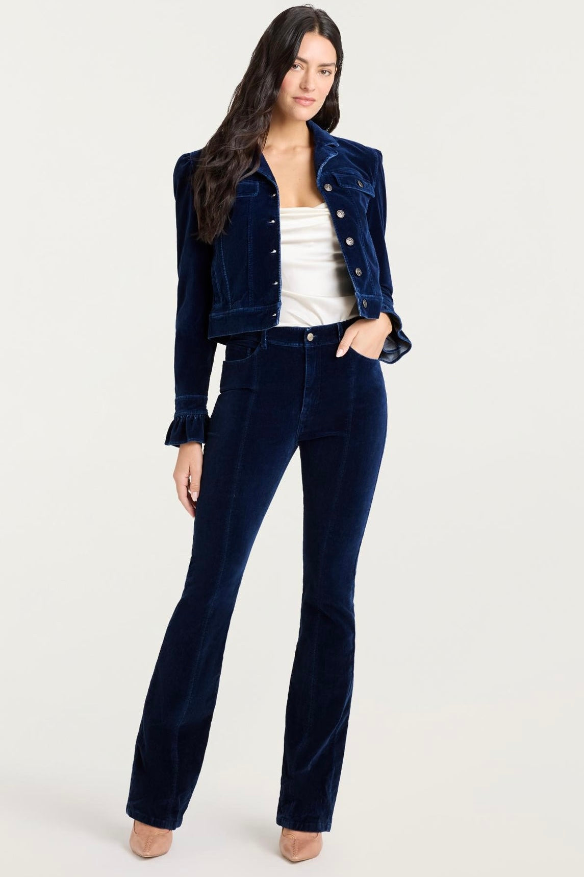 Le pantalon Shailene en velours denim de Cinq à Sept réinvente une silhouette intemporelle dans un tissu saisissant. Conçu avec la jambe évasée emblématique de la marque, ce modèle est taillé dans un velours denim doux qui allie structure et douceur. La texture riche apporte une touche sophistiquée au denim quotidien, le rendant aussi approprié pour des après-midis décontractés que pour des sorties en soirée. Une fermeture classique à boutons et zip ainsi que des poches fonctionnelles à l'avant et à l'arrière maintiennent un aspect utilitaire, tandis que la coupe longue allonge la silhouette avec une élégance sans effort. Qu'il soit associé à un chemisier élégant pour le dîner ou à un pull douillet pour la journée, le pantalon Shailene offre une pièce polyvalente et moderne, au style indéniablement soigné.