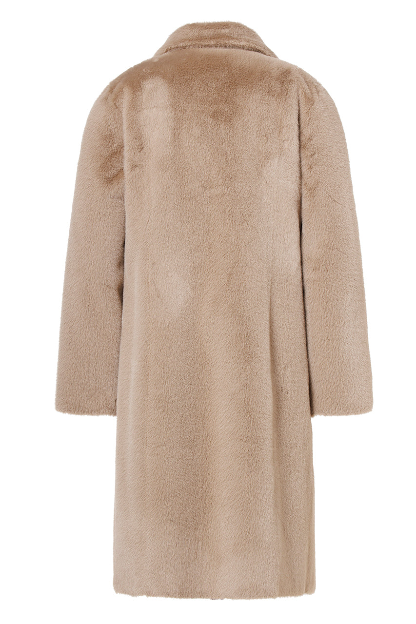 Confectionné dans un design réversible polyvalent, ce manteau présente une fausse fourrure douce d'un côté et un daim élégant avec des coutures visibles de l'autre. Un col à revers, une fermeture magnétique cachée et des poches discrètes dans les coutures latérales renforcent sa silhouette épurée.