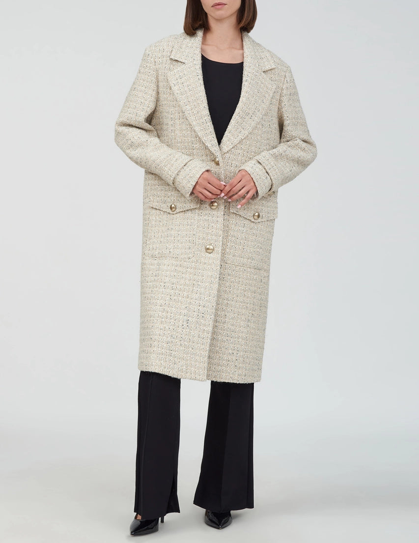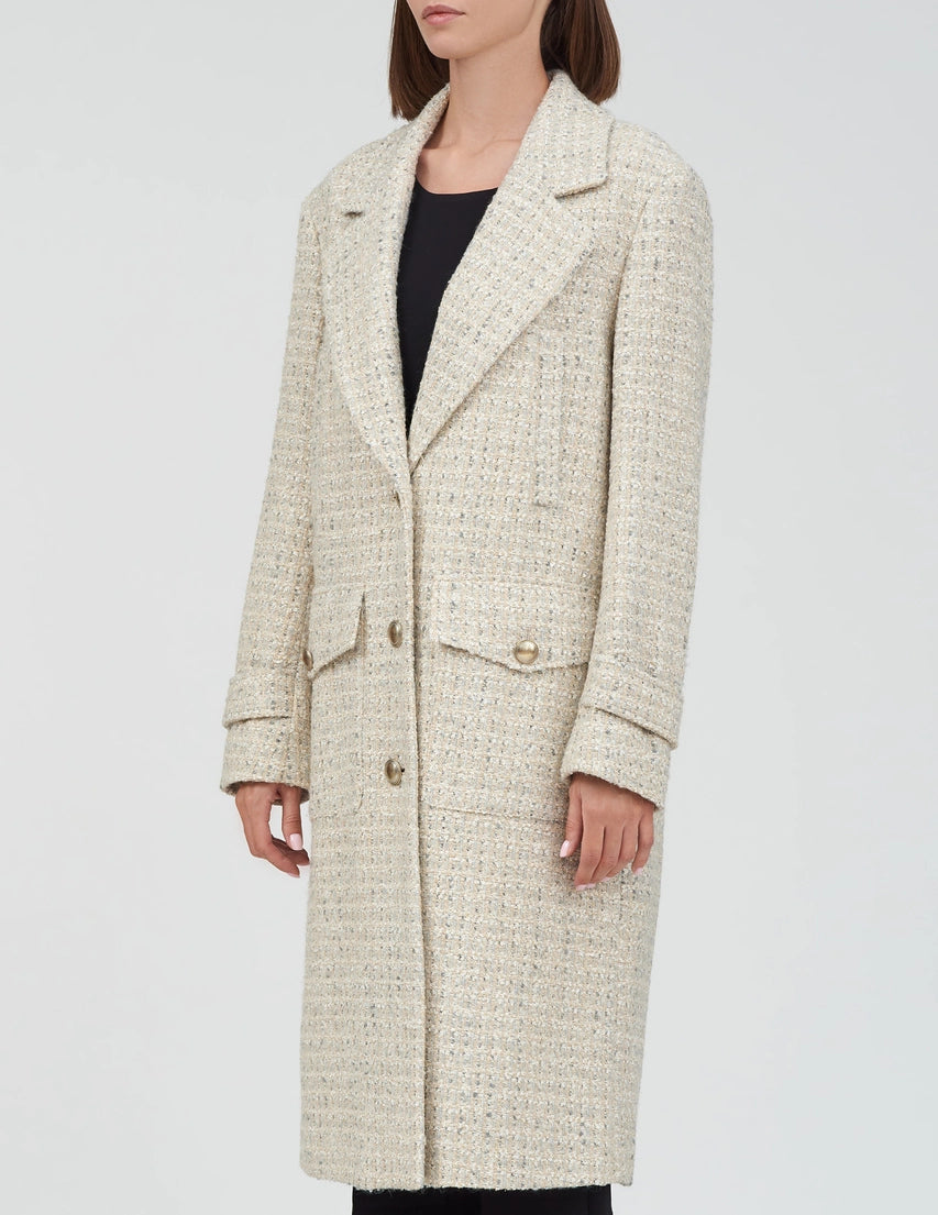 Ce manteau élégant couleur lait de Riani présente une silhouette droite, des manches longues et quatre poches extérieures. Confectionné dans un mélange doux de coton, laine et polyester avec des détails subtils en lurex, il offre chaleur et style raffiné.