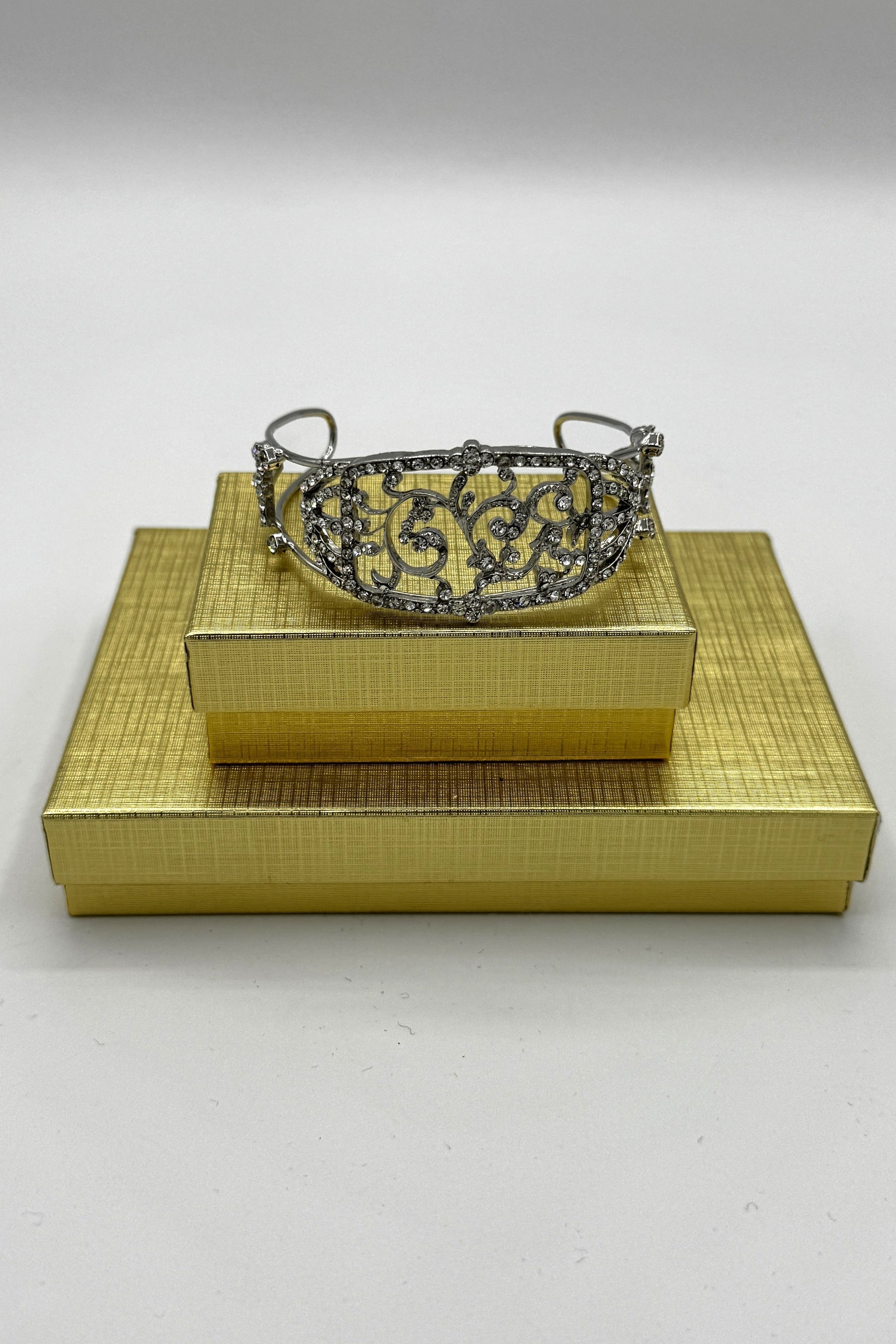 Ce bracelet de mariée exquis présente un filigrane ajouré orné de cristaux Swarovski scintillants, formant de délicats motifs en croix. Sa finition argentée d'inspiration antique et ses détails en treillis complexes créent un jeu élégant de lumière et de texture - un complément parfait à toute tenue de mariée.