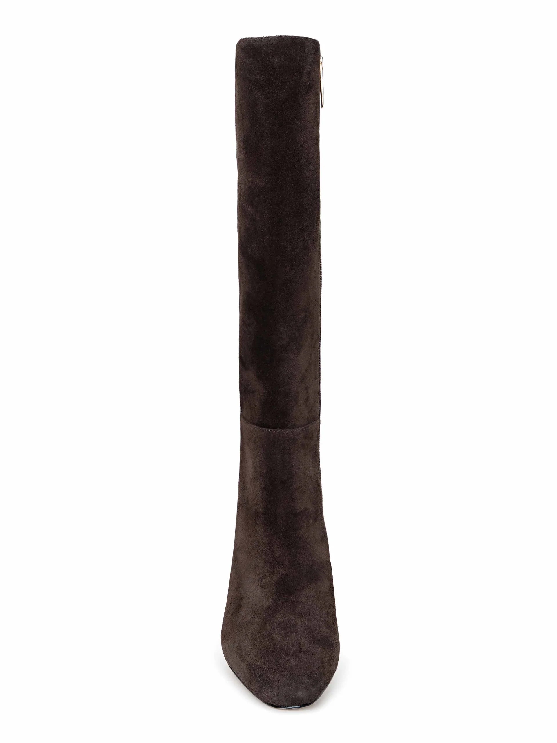 La botte Eugenie est un incontournable intemporel de l'automne à l'hiver, confectionnée en daim riche avec un bout amande et un talon bloc confortable pour une aisance du jour à la nuit. Polyvalente et neutre, elle s'accorde parfaitement avec tout, du denim aux robes.