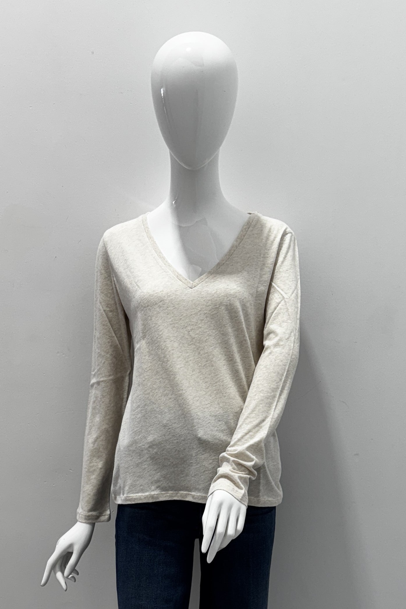 Ce haut à manches longues est confectionné en coton biologique de luxe, offrant un confort respirant avec une sensation douce au toucher. Doté d'un col en V flatteur et d'une silhouette épurée et intemporelle, c'est un essentiel polyvalent pour superposer avec une aisance moderne et une élégance discrète.