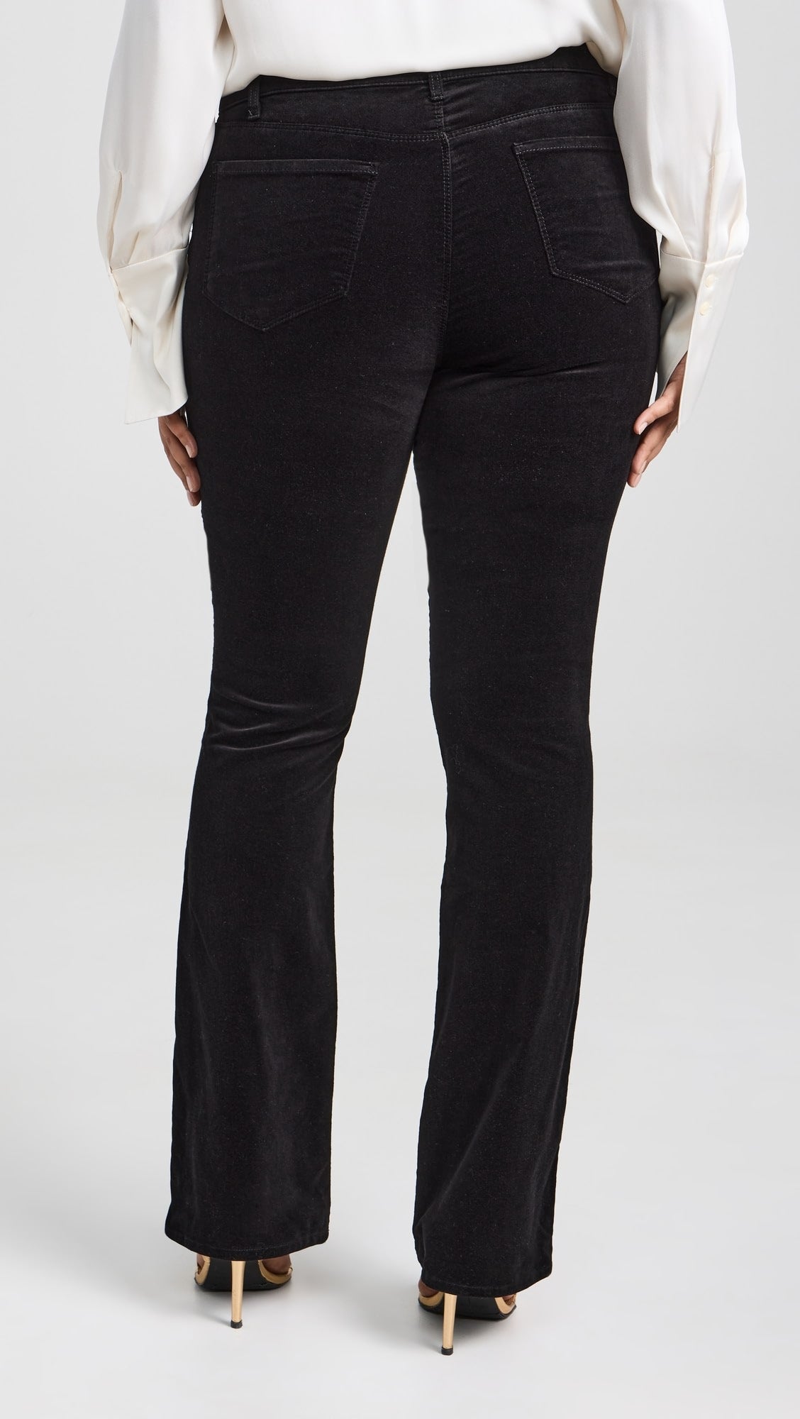 Un jean taille haute à jambe droite slim et élancée en denim stretch velours noir luxueux. La ceinture cintrée affine et lisse la taille naturelle, tandis que le denim stretch velours épouse la hanche, la cuisse et le genou avant de s'ouvrir en jambe droite. Comprend une construction à cinq poches et une fermeture éclair à l'avant.