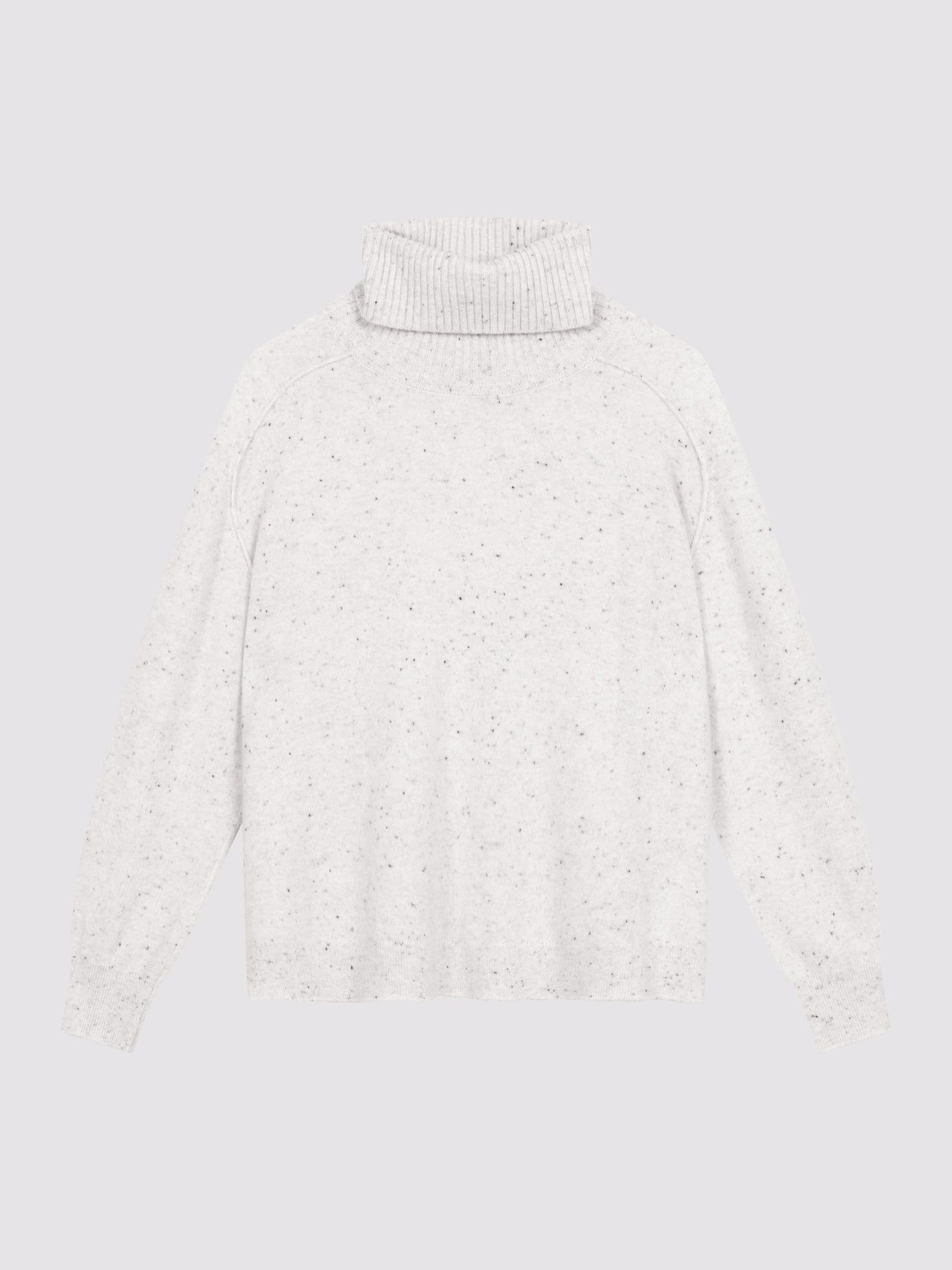 Confectionné en pur cachemire, ce pull col roulé décontracté présente un tricot moucheté doux et des épaules tombantes pour une silhouette décontractée. Le col roulé côtelé et les poignets offrent une structure confortable, tandis que la fluidité du tombé le rend idéal pour un superposition élégante et sans effort.