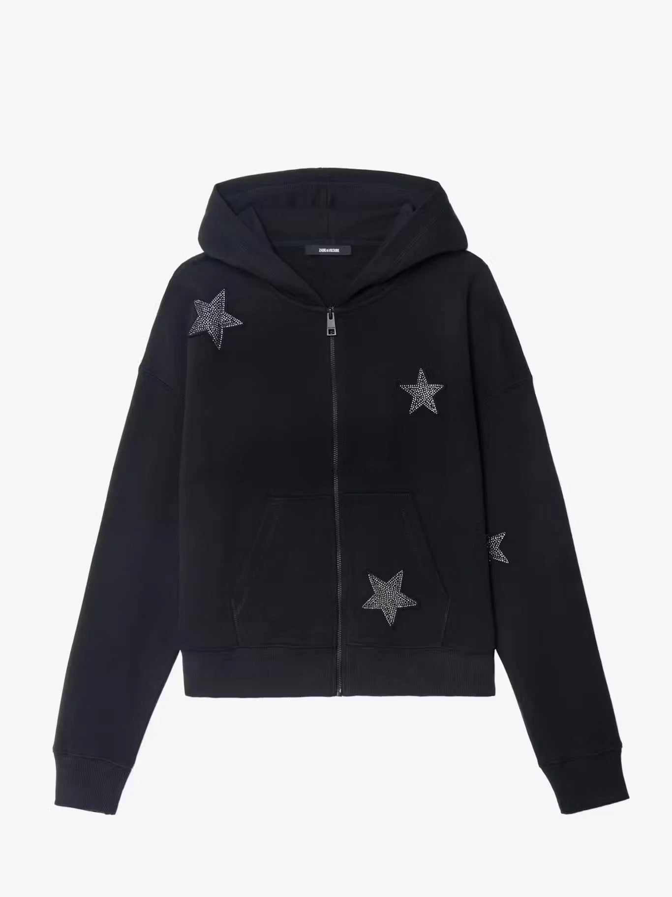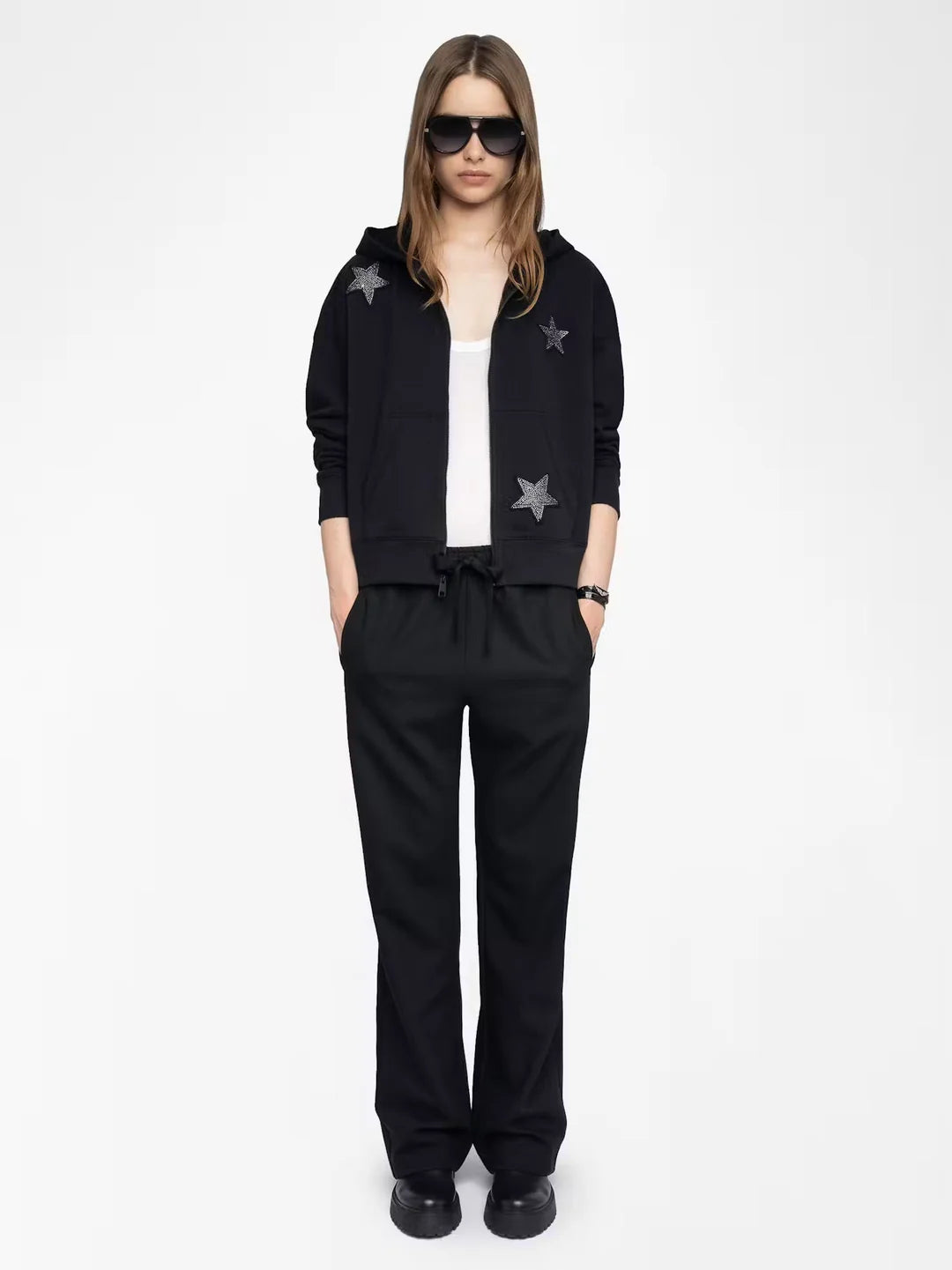 Le sweat à capuche embellie Zadig & Voltaire Mia Black allie confort et détails chics pour un look décontracté raffiné. Doté d'étoiles en diamanté dispersées sur son tissu noir, ce sweat à capuche zippé offre un scintillement subtil. Ses manches longues comprennent des passages pour le pouce pour plus de style et de praticité, tandis que la coupe ample assure une liberté de mouvement. Pour une silhouette ajustée, envisagez de prendre une taille en dessous pour un aspect plus cintré. Ce sweat à capuche est une fusion gracieuse entre vêtement décontracté et ornementation sophistiquée.