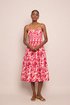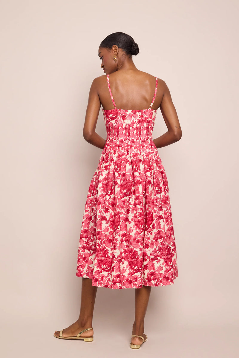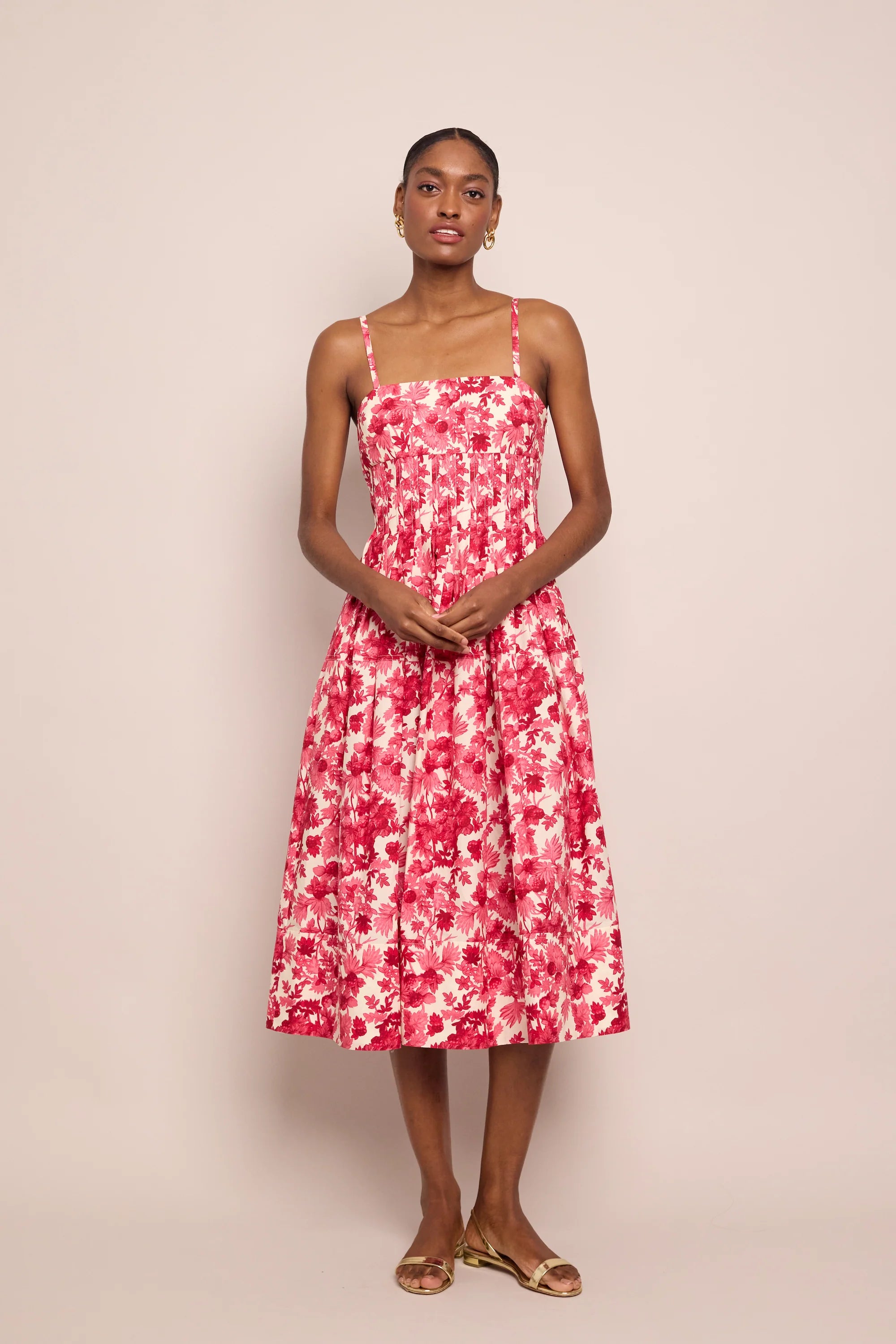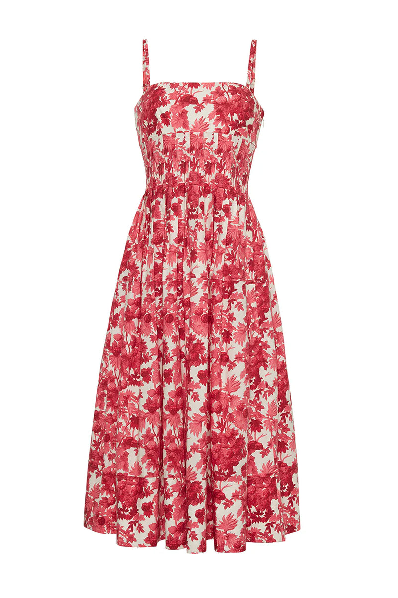 La robe midi Sea Island de Cara Cara incarne l'élégance estivale avec son imprimé floral romantique et sa silhouette fluide évasée. Dotée d'un décolleté carré, de bretelles ajustables et d'un corsage plissé qui s'ouvre sur une jupe évasée en A, elle offre une forme flatteuse et féminine.