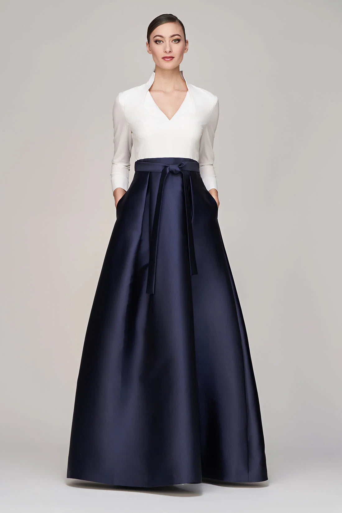 Dotée d'un décolleté cygne et d'une silhouette trapèze, cette robe longue jusqu'au sol offre une légère élasticité pour le confort et des manches coudées élégamment ajustées.