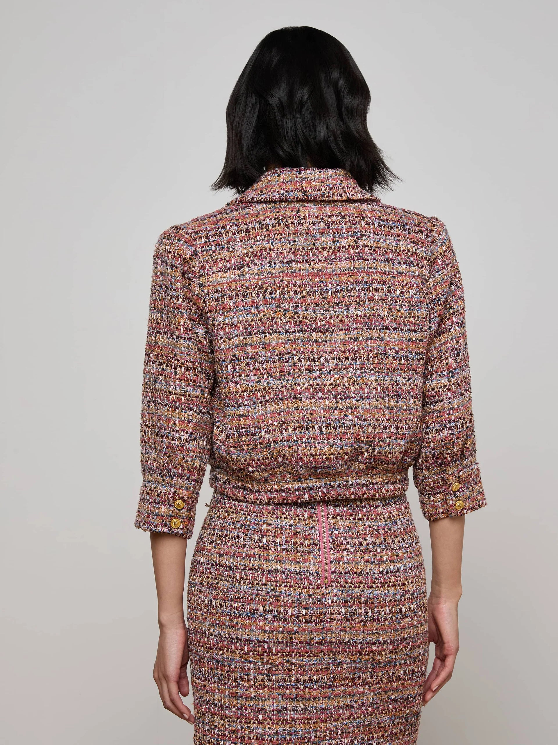 Une veste féminine à manches trois-quarts confectionnée dans un tweed texturé coloré. Portez la Jia comme un haut ou une seconde couche.