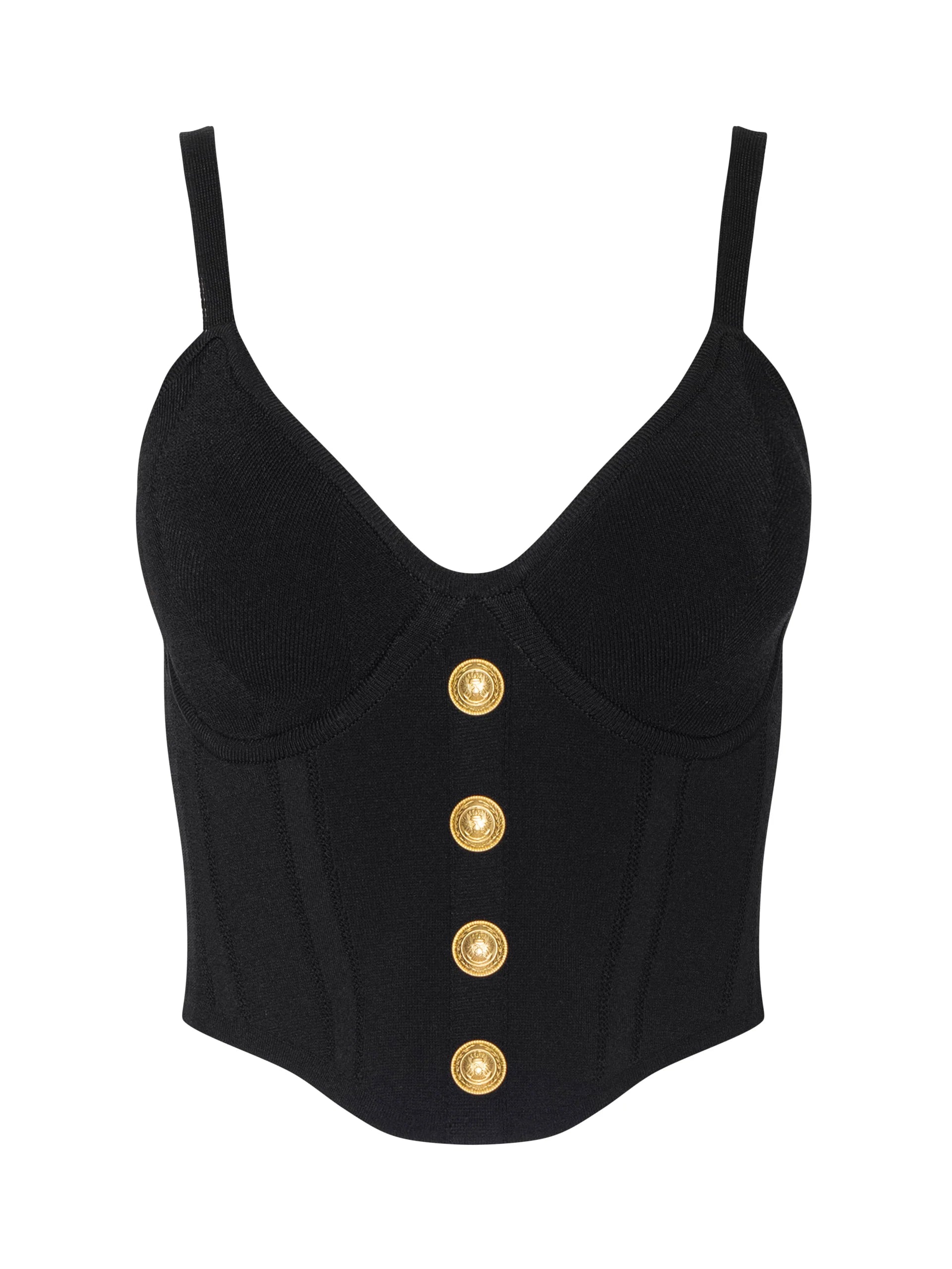 Découvrez l'Artemis, un corset en maille sculptée avec un décolleté en cœur, des bonnets structurés et des boutons dorés sur le devant. Portez-le avec un jean pour un look chic en ville.
