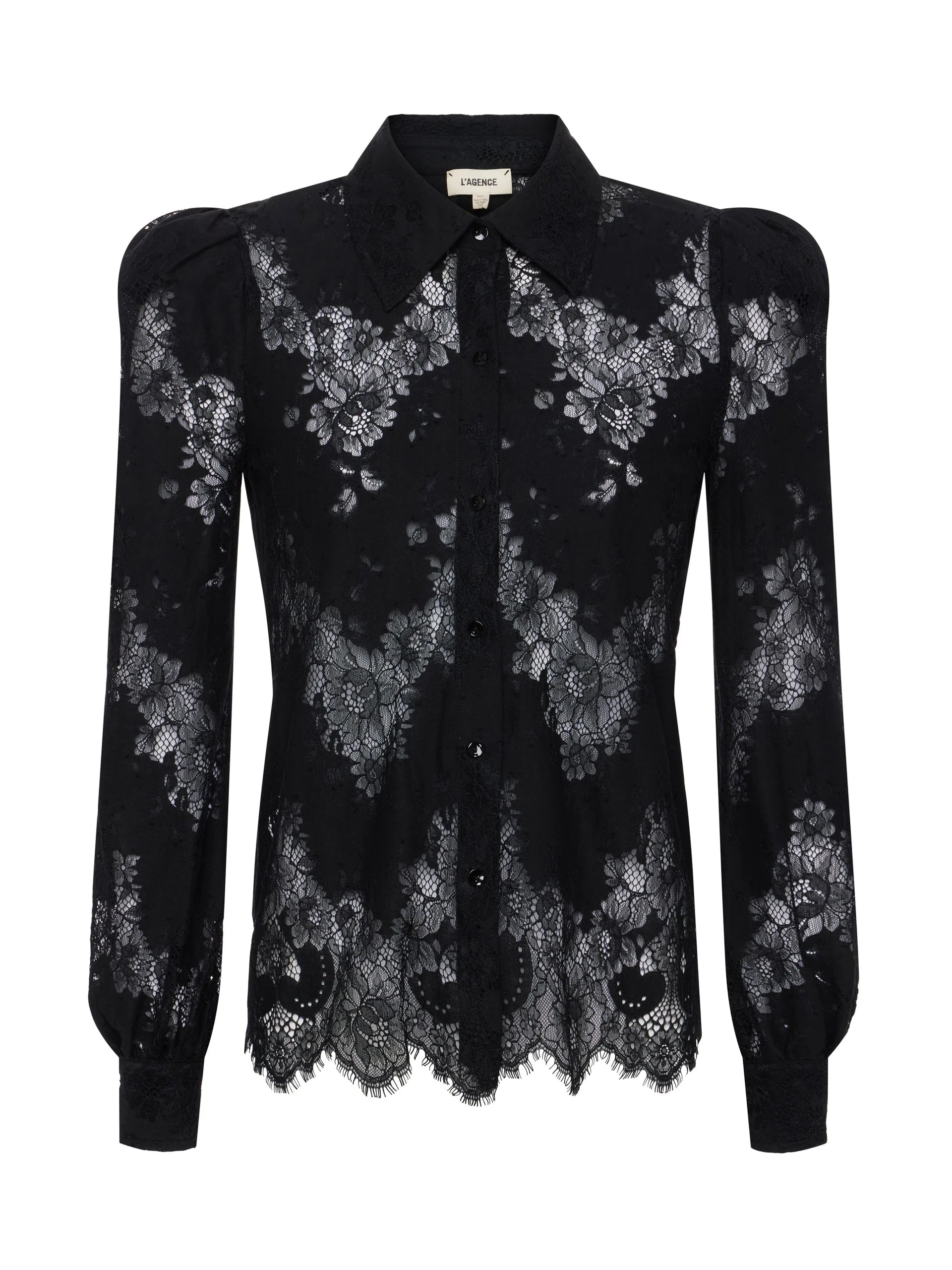 Notre chemisier boutonné le plus féminin, maintenant en dentelle noire chic. Les épaules bouffantes créent un volume doux tandis qu'un col net ajoute de la définition. Associez-le à un denim blanc pour un look romantique du jour à la nuit.