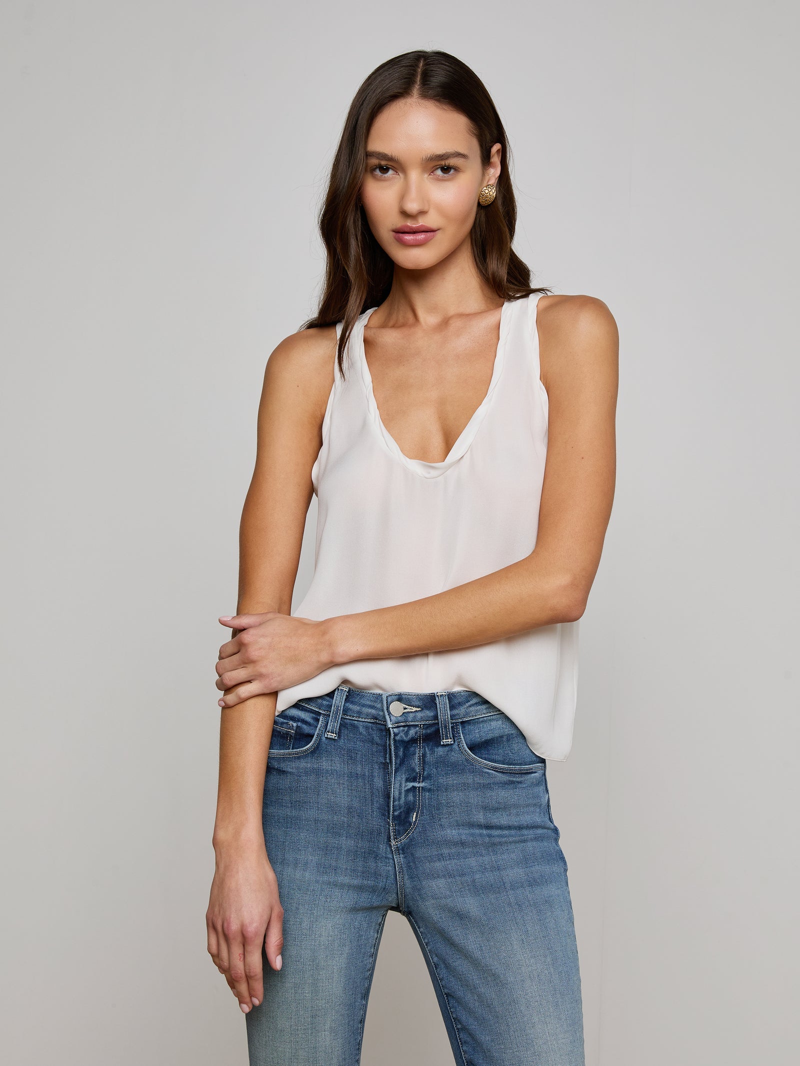Élevez vos essentiels avec le débardeur Trixi, doté d'un décolleté en scoop et de délicates bretelles en bande torsadée. Ce design léger et fluide tombe magnifiquement, offrant une élégance sans effort. Parfait pour superposer ou porter seul, c'est un incontournable intemporel de la garde-robe.
