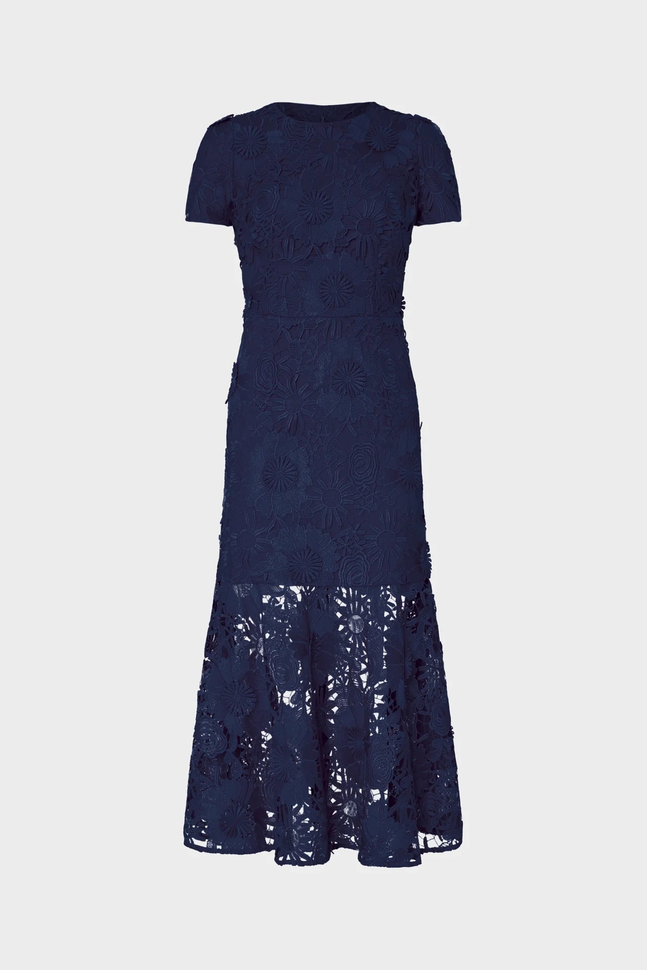 La robe Milly à manches courtes en dentelle captive avec des détails en dentelle florale complexe, des accents d'ourlet transparent, et une silhouette flatteuse évasée. Dotée d'un col bijou, d'une taille cintrée, et de bords festonnés, ce modèle bleu marine allie féminité moderne et élégance intemporelle, parfait pour des occasions sophistiquées du jour à la nuit.