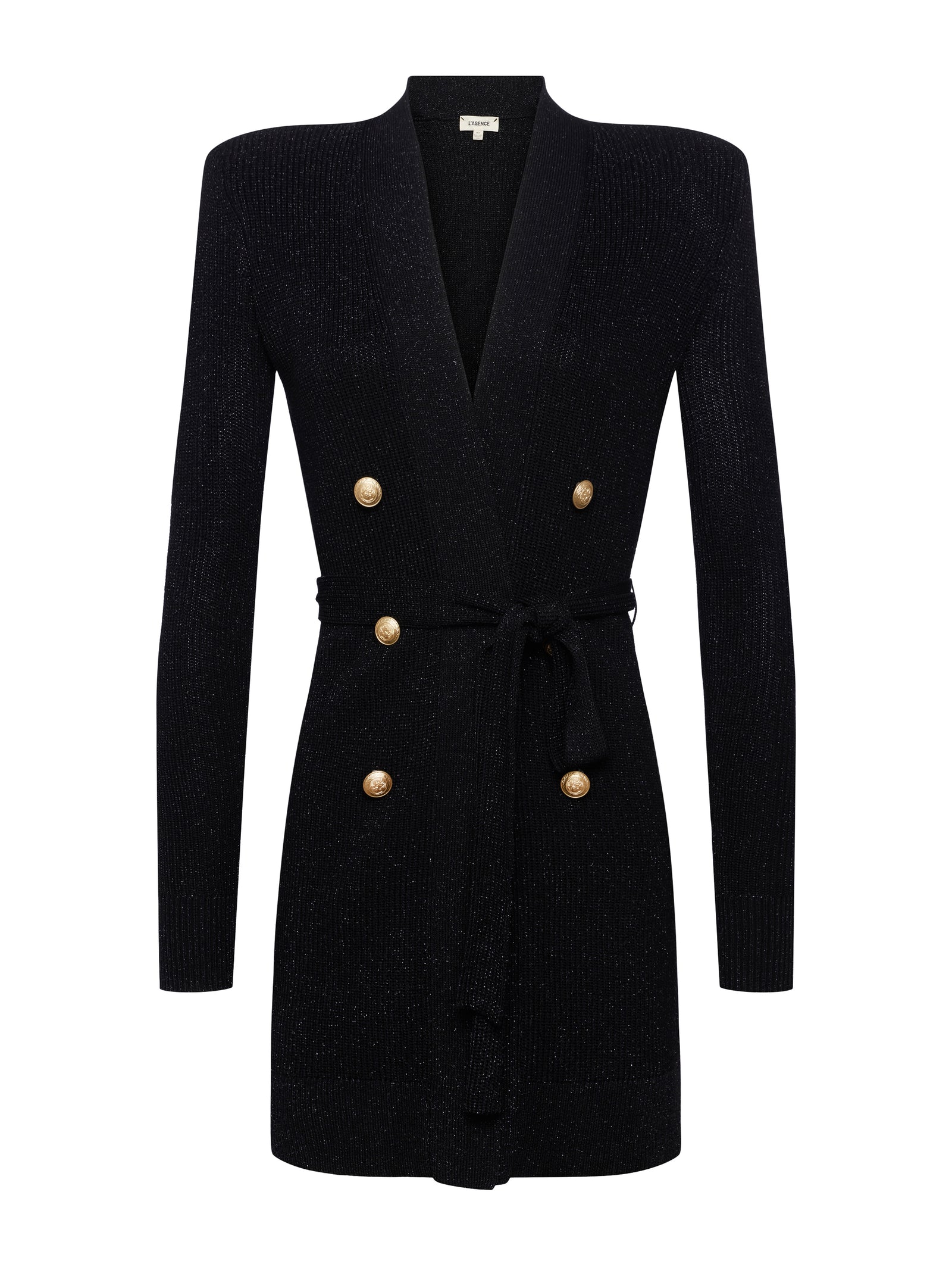 Un cardigan croisé double boutonnage d'un chic sans effort en noir pur avec un éclat métallique scintillant. La coupe longue et ajustée s'affine élégamment de l'épaule marquée à la taille avant de tomber jusqu'à mi-cuisse. Détail avec des boutons accent en dôme embossés dorés de luxe. Fermeture à nouer avec ceinture amovible.