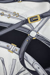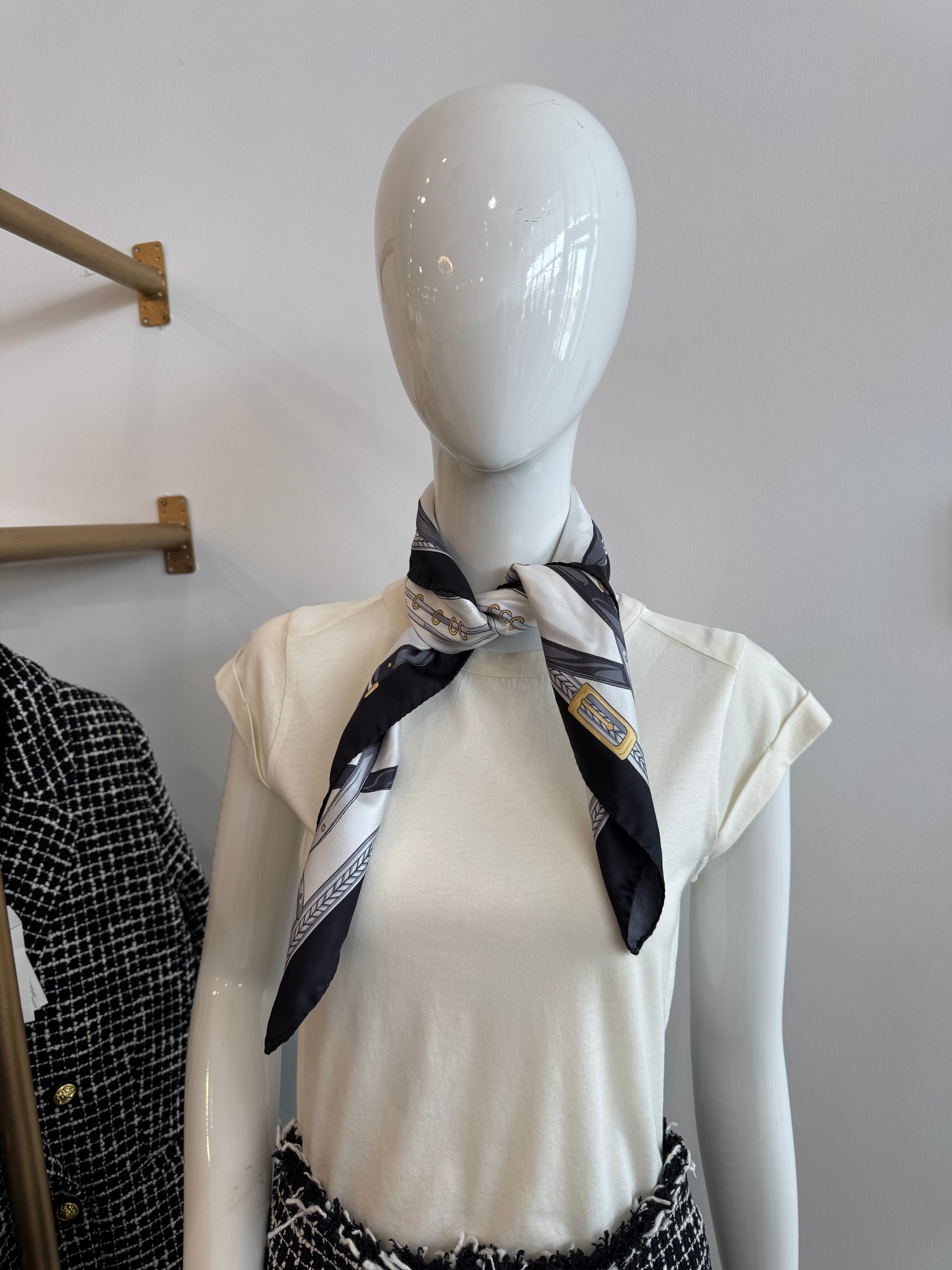 Fabriqué en pure soie, ce foulard présente un imprimé audacieux inspiré de l'équitation. Sa finition luxueuse et ses détails raffinés ajoutent de la sophistication à n'importe quel ensemble.