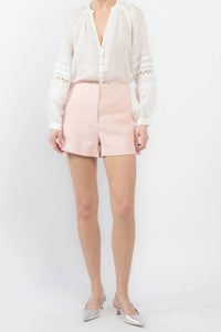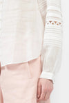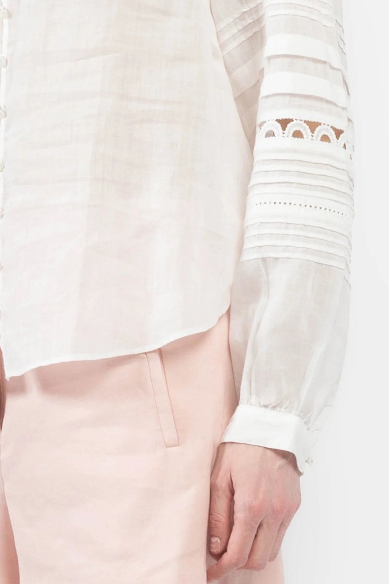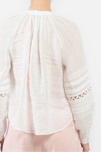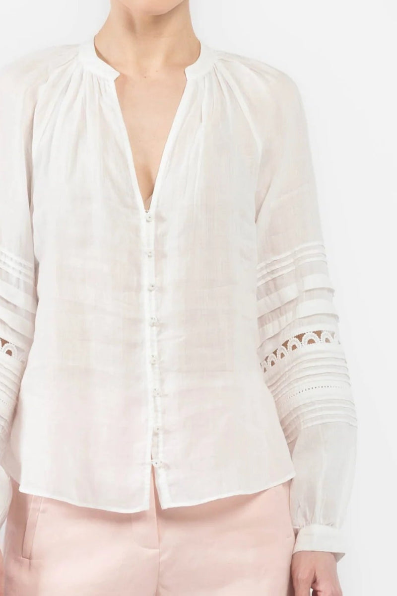 Le haut Ailani de Veronica Beard est un chemisier léger et semi-transparent confectionné en coton blanc net. Doté de détails complexes de plis pincés, d'inserts en crochet ton sur ton aux manches, et d'un col doux froncé, il équilibre une texture délicate avec une aisance moderne. Une fermeture à boutons sur le devant et un ourlet arrondi complètent la silhouette raffinée.