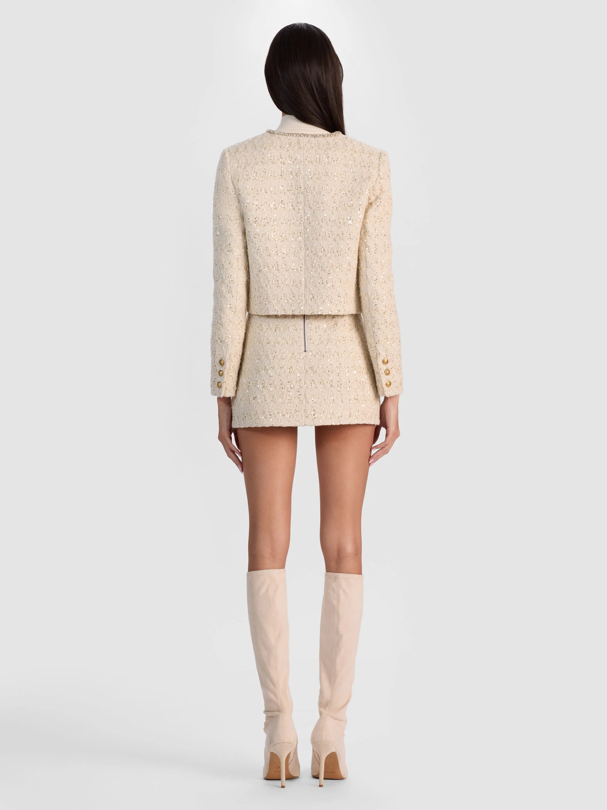 The Kidman jacket delivers preppy polish with a dose of sparkle, tailored in shimmering tweed and finished with jeweled trim. Cropped in length, it layers beautifully over dresses or high-waisted trousers. The open front keeps it relaxed while still feeling refined. A modern update to the ladylike jacket, it’s elegance with an edge.
