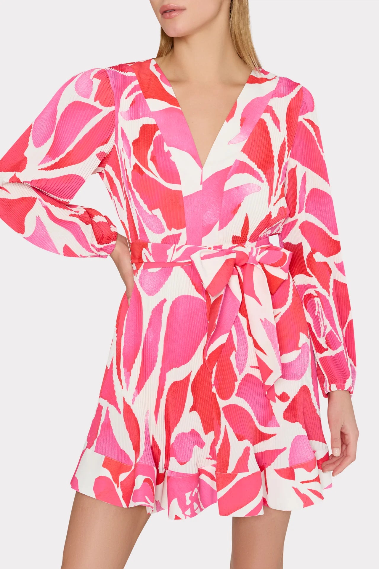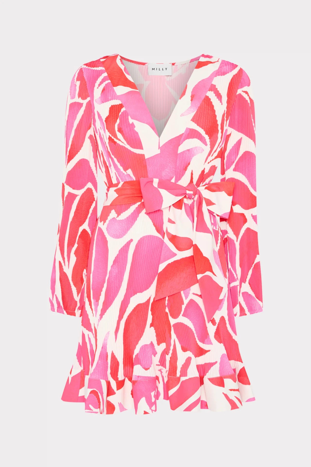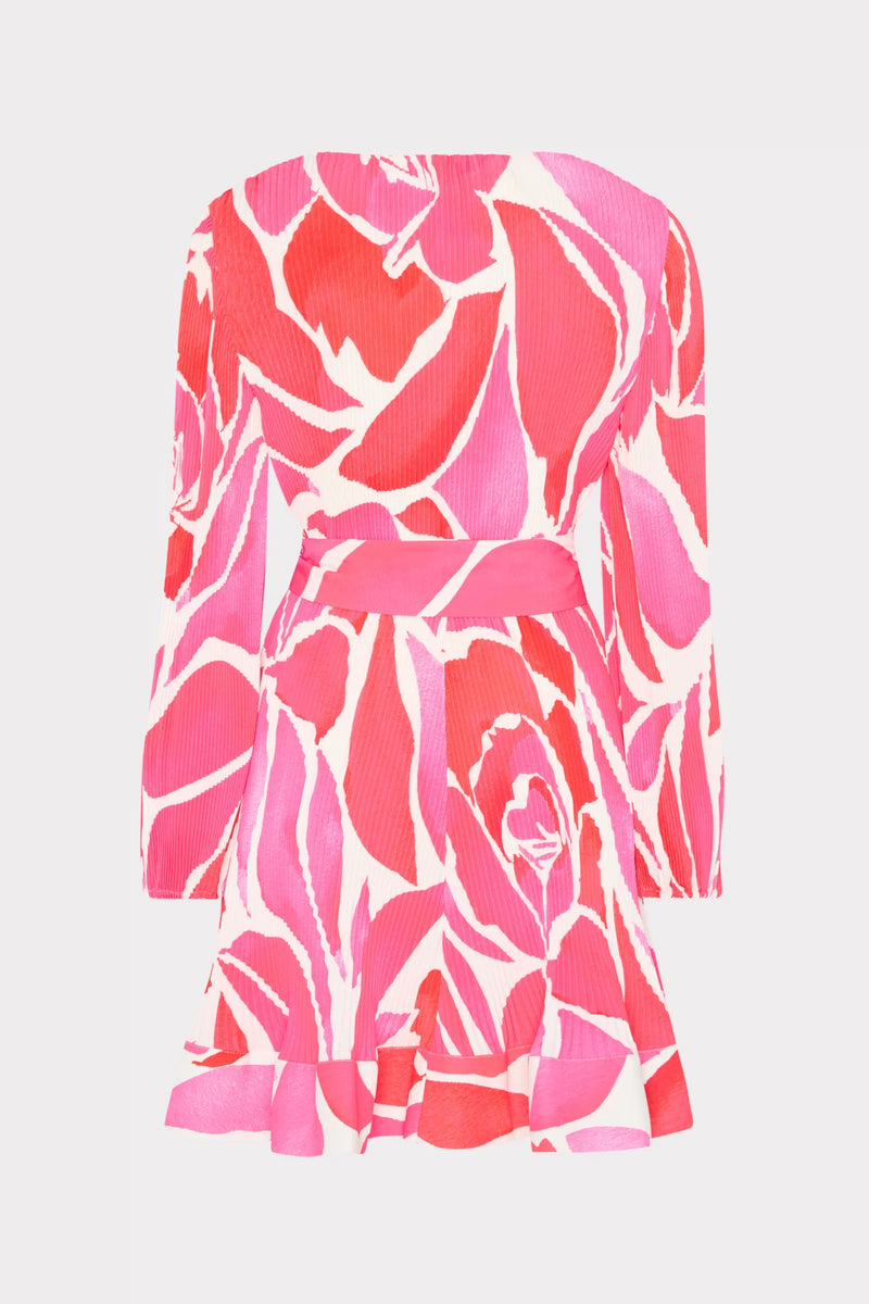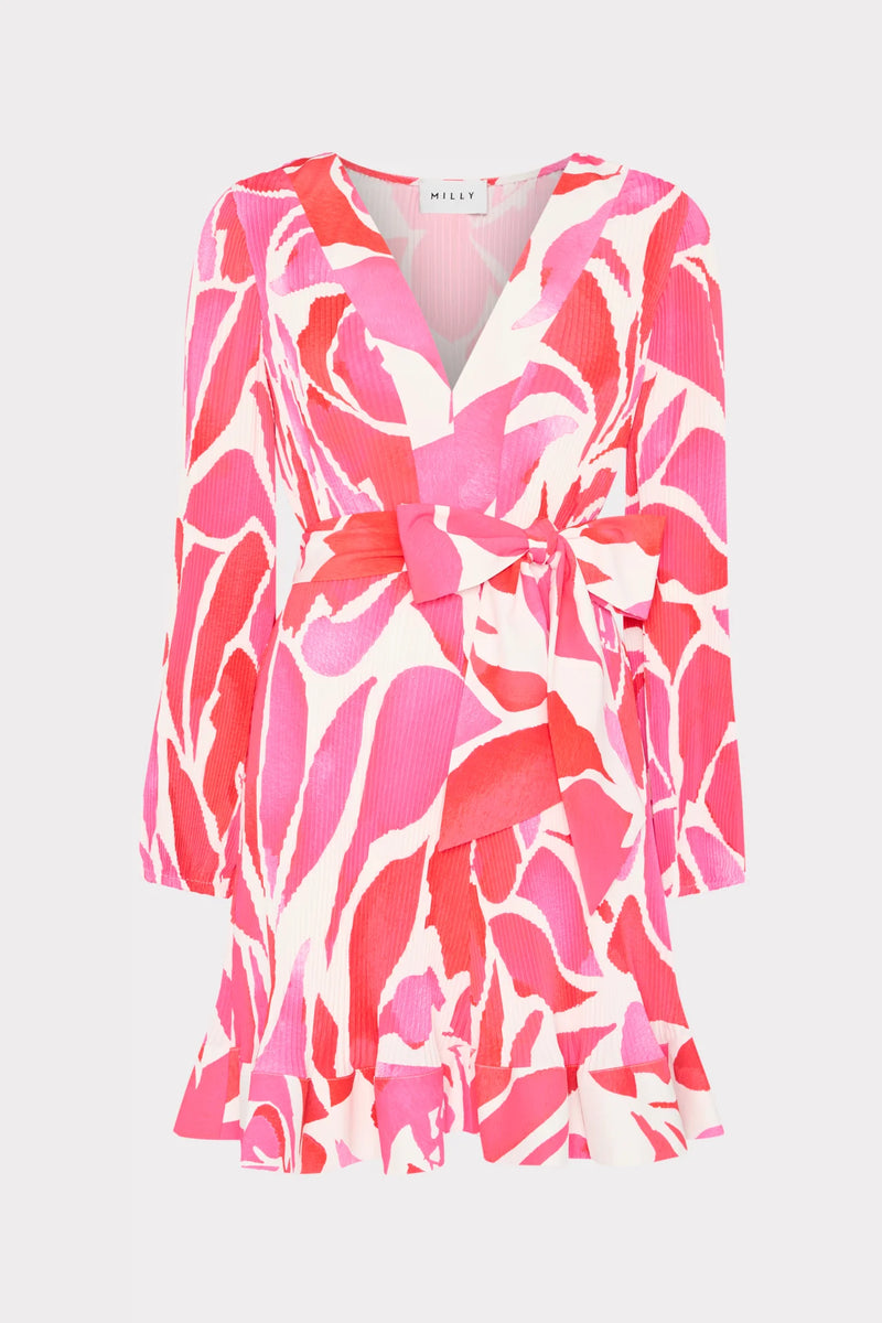 Our best-selling mini dress features a slim peasant sleeve, a v-neckline, and MILLY signature pleating throughout. It’s finished with a self-tie at the waist for added shape. This season, it’s offered in our romantic Dream Rose print—a swirl of pink and red roses atop a white backdrop.