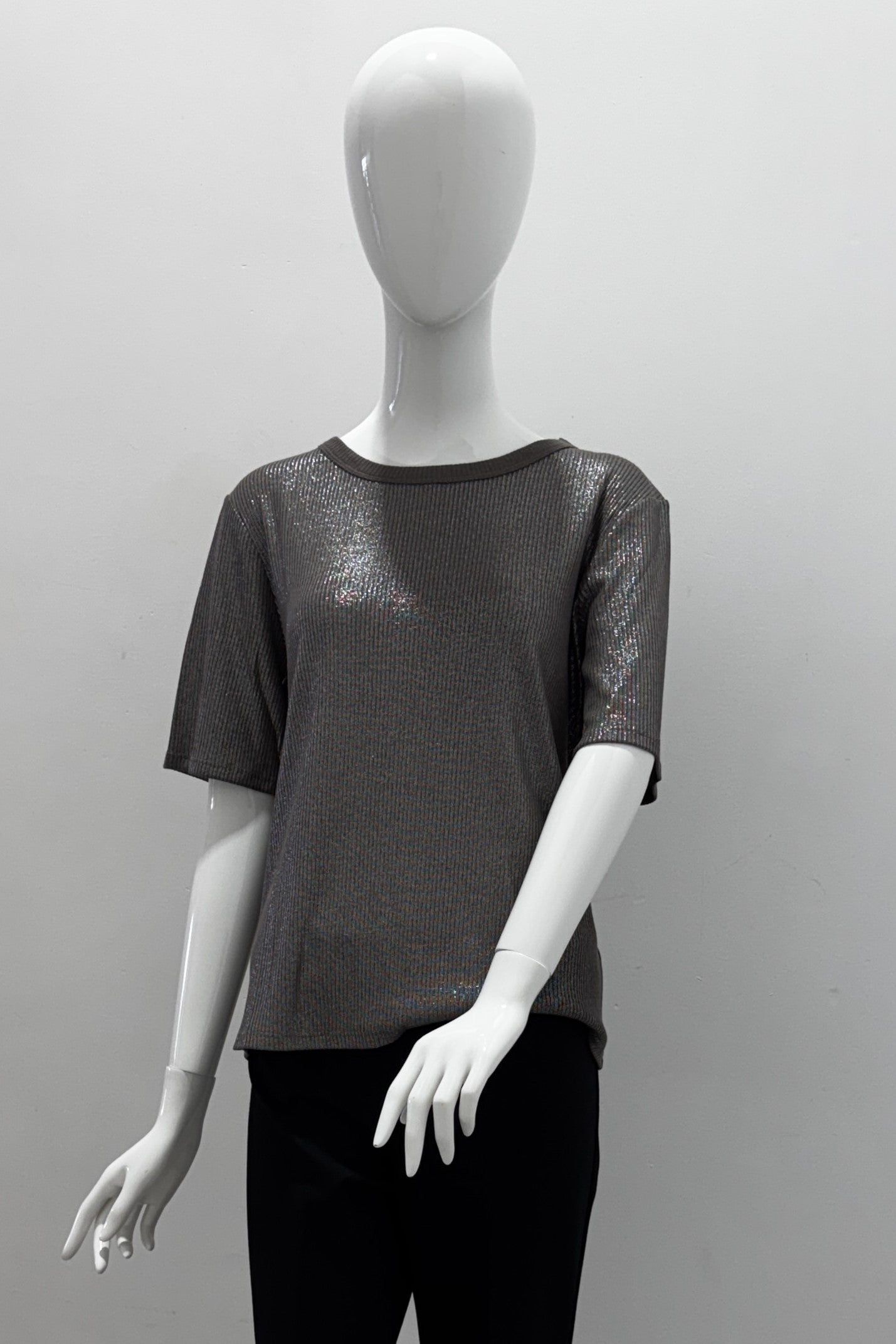 This round-neck t-shirt in metallic ribbed knit offers a subtle shimmer with effortless drape. Designed with short sleeves and a relaxed silhouette, it blends comfort with understated glamour. A versatile piece that elevates casual looks while transitioning seamlessly into evening styling.