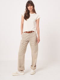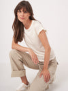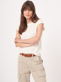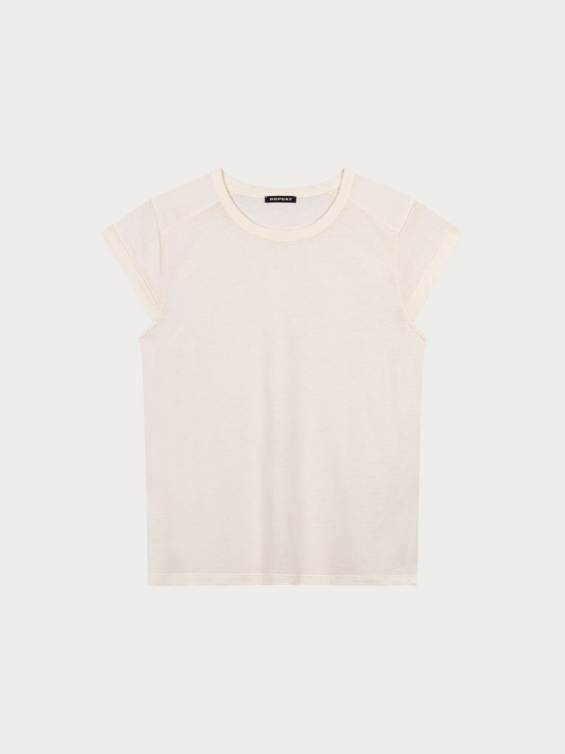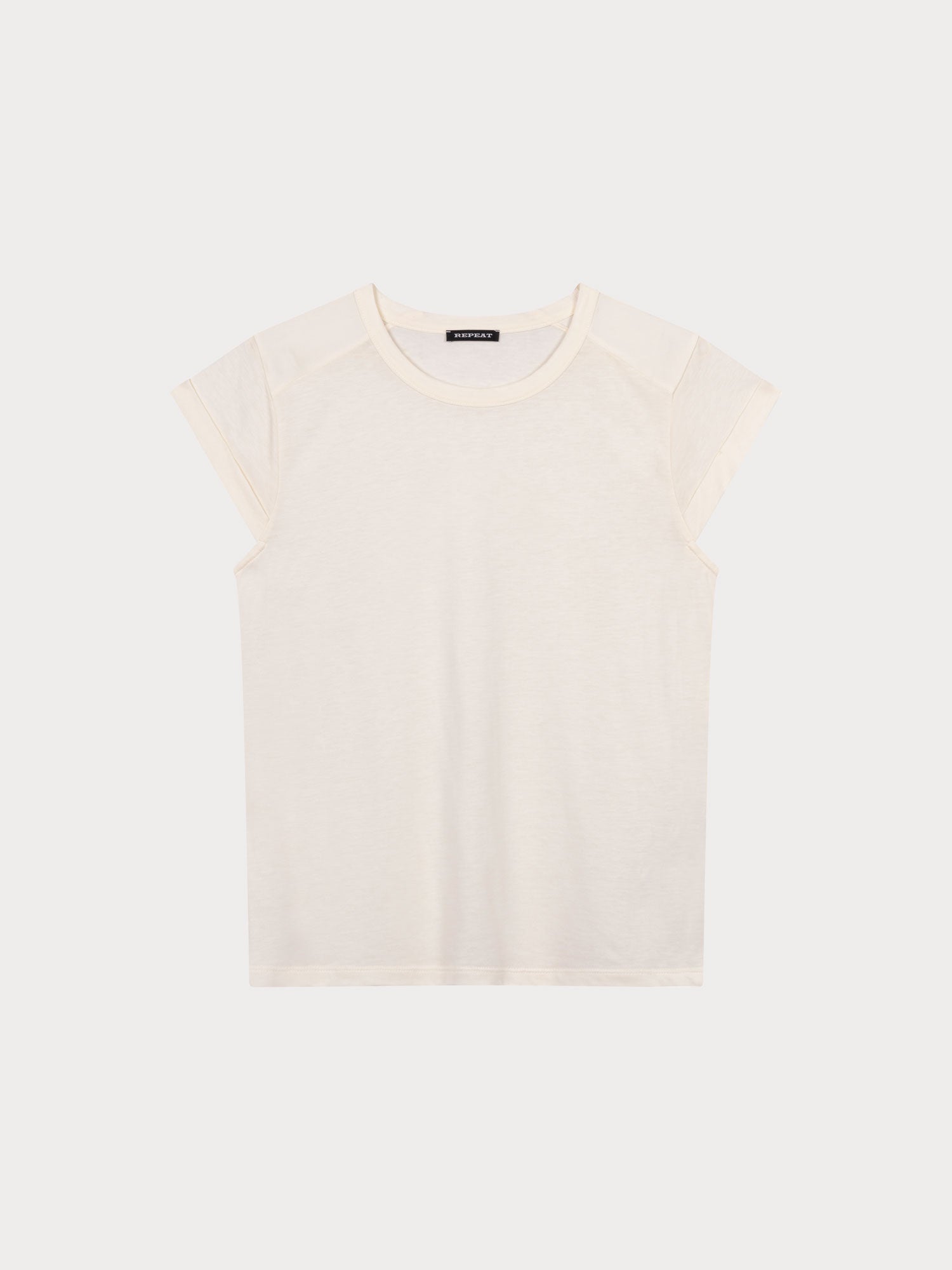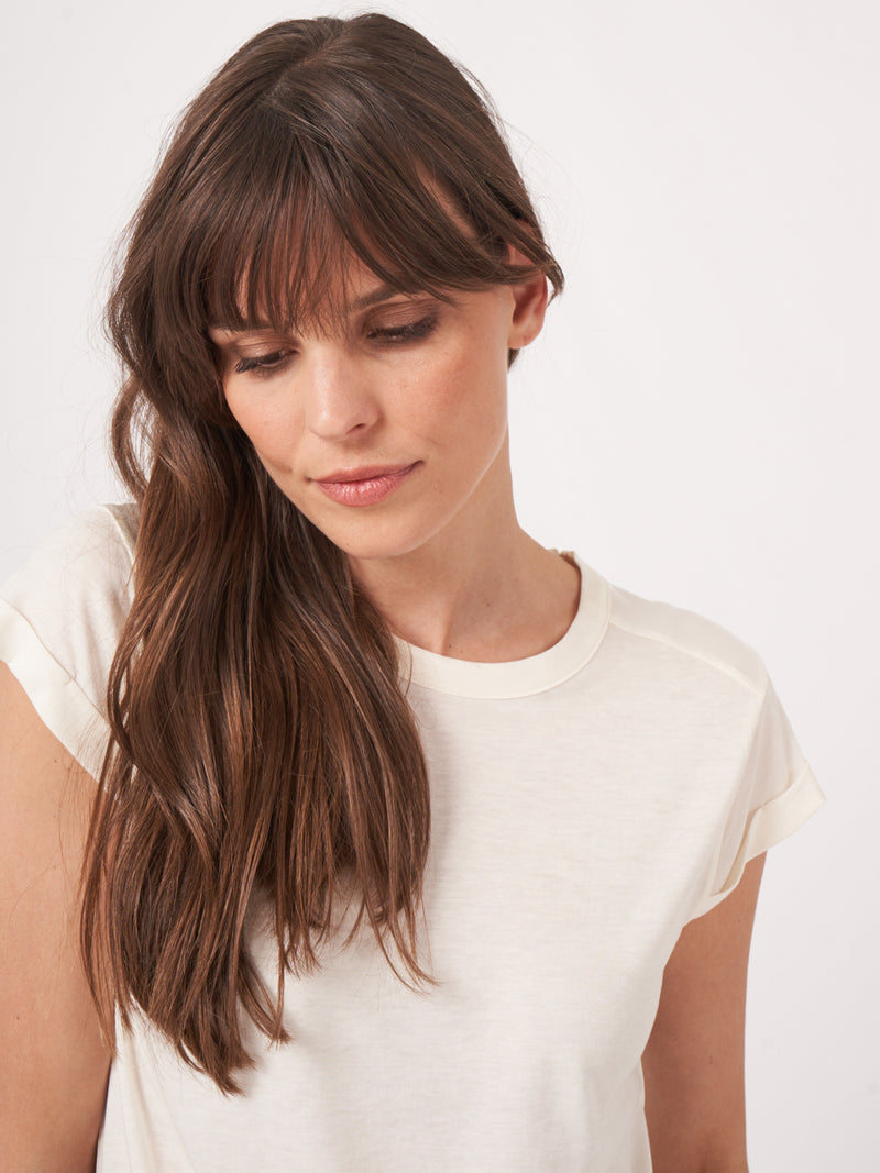Effortlessly refined, this jersey tee blends high-quality lyocell and cotton for a soft, breathable feel. Designed with a round neckline and rolled-up cap sleeves, it offers a relaxed yet polished look. A silk shoulder insert adds a touch of luxe, elevating its casual appeal.