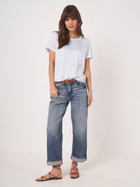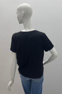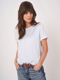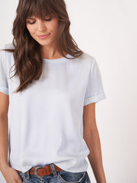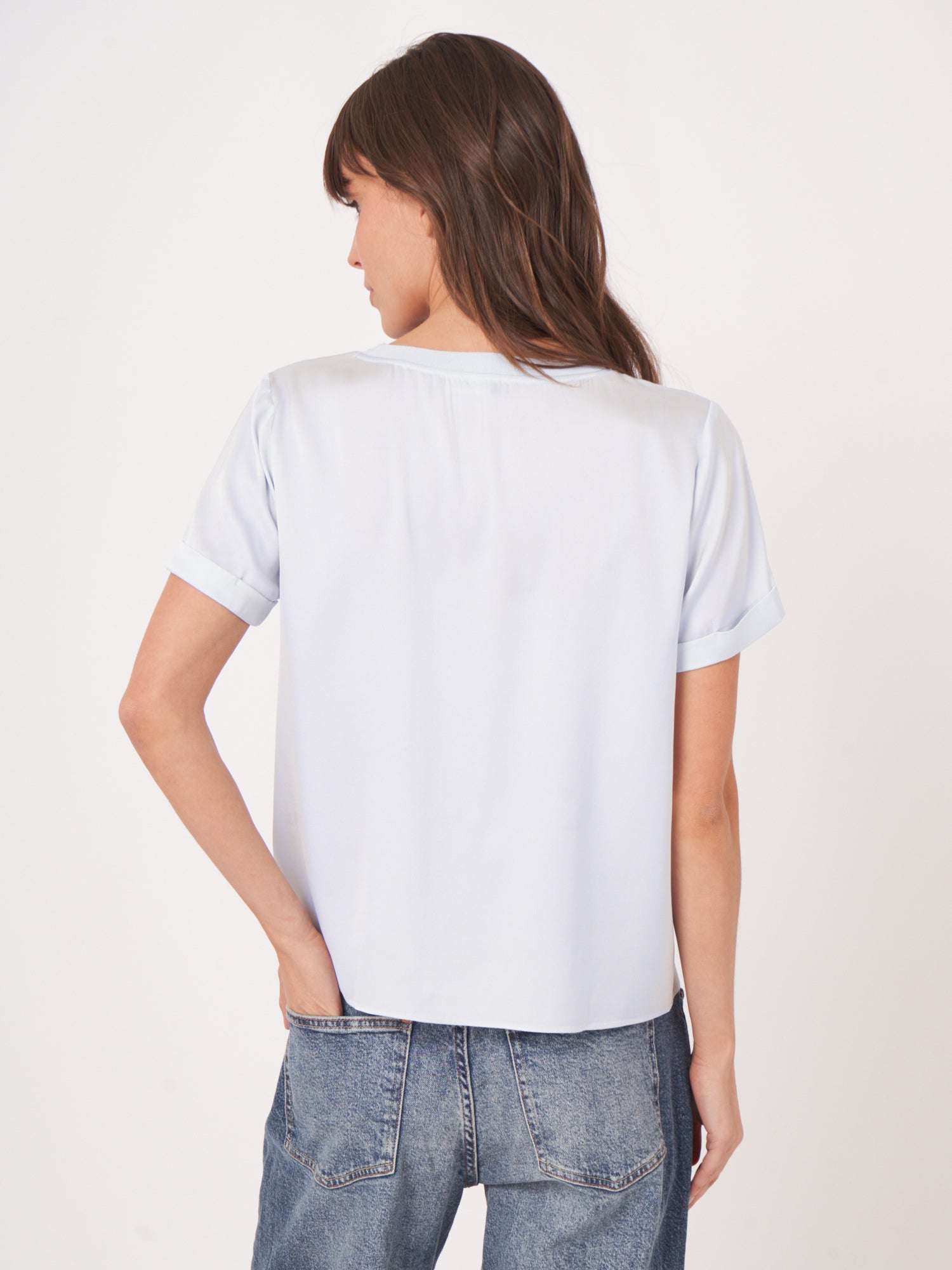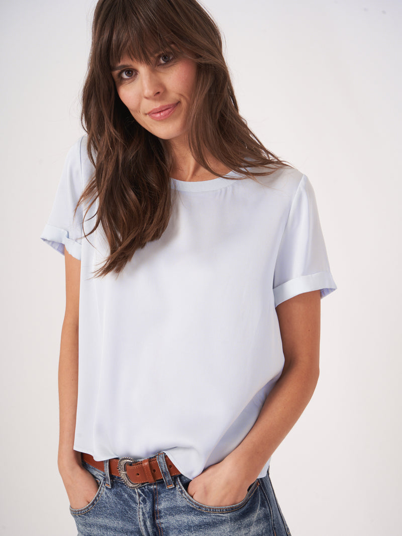 Elevate your wardrobe with this effortlessly elegant woven blouse. Crafted from stretch silk, it offers a fluid drape and luxurious feel. The round neckline and rolled-up short sleeves add a refined touch, while the straight cut ensures a relaxed yet polished fit. A timeless essential.