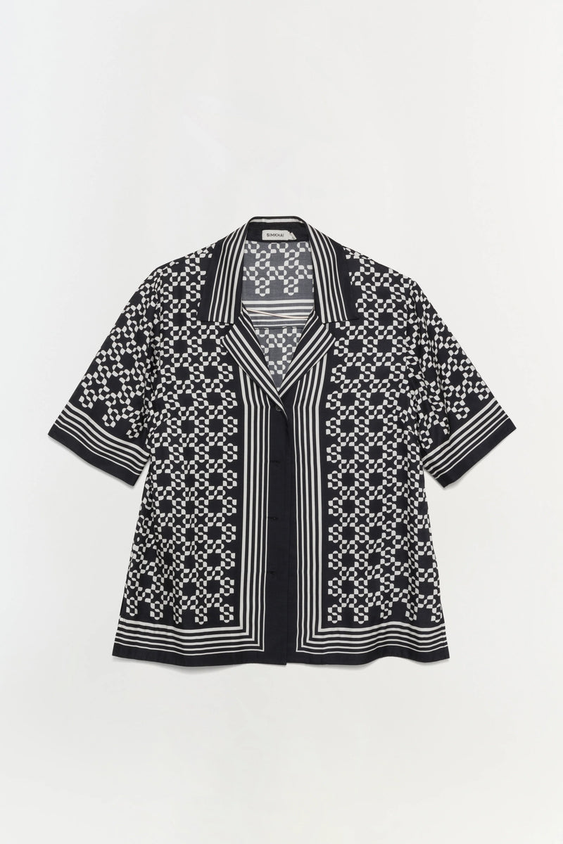 The Koda Shirt in Black. Crafted as a versatile cover-up with intricate detailing, this short-sleeve button-down features a distinctive logo scarf print.
